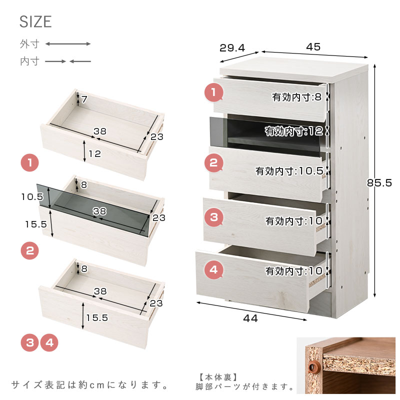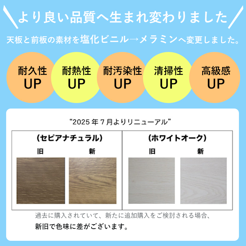 | 商品仕様 | 天板・前板:塩ビ化粧繊維板→メラミン化粧繊維板に変更(2025年7月から) その他:プリント紙化粧繊維板 ガラス:強化ガラス(5mm厚) |