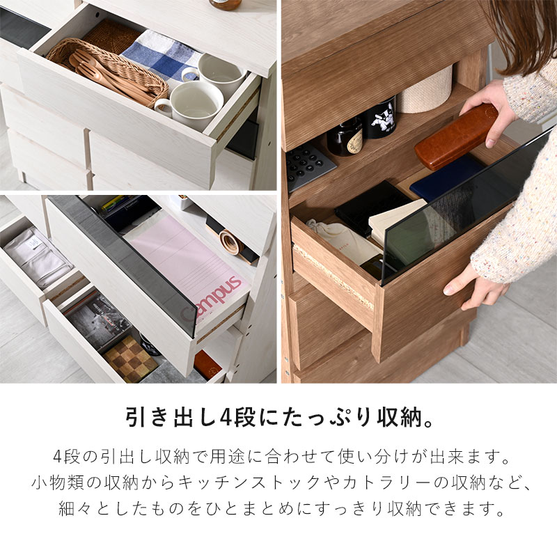 | デッドスペースだったカウンター下にぴったりな収納庫の登場です。高さは一般的なカウンター下のサイズに合わせて(約)85.5cmの高さに設計されています。このサイズは腰高窓と呼ばれる一般的な窓の高さと同じなので窓の下に置いて頂くにもぴったりなサイズとなっております。引き出しの下部には切り欠き加工がされておりとても持ちやすく設計されております。また中央部分にはガラス窓を装着させて頂いているので中に入っているものがひとめで解る嬉しい設計です。 | |