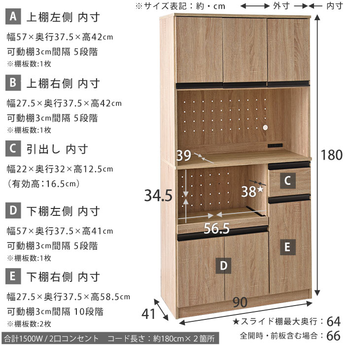 食器棚 レンジ台 レンジボード 幅90cm レンジラック 大型レンジ オープンラック カップボード キッチンボード ラック 引き出し 収納 コンセント 大容量 家電収納 スライド棚 キッチン収納