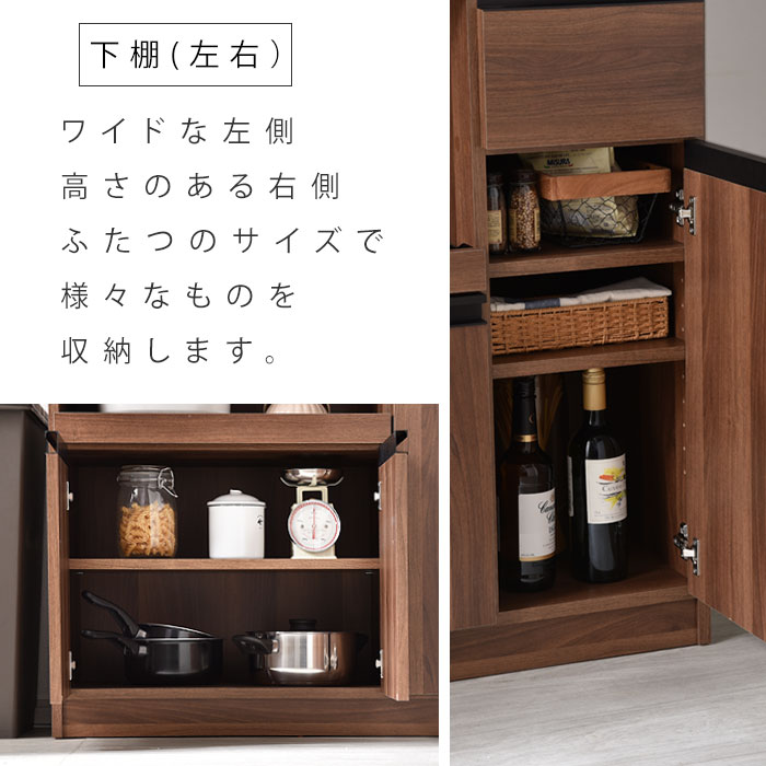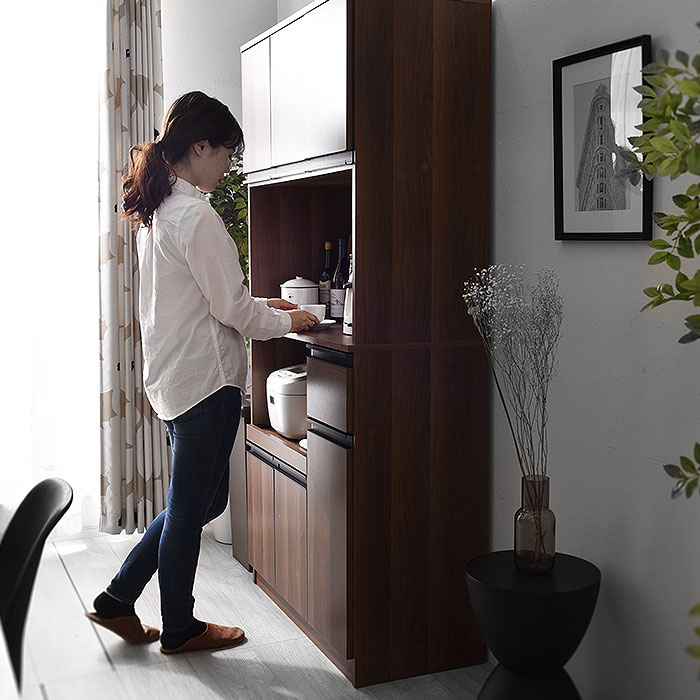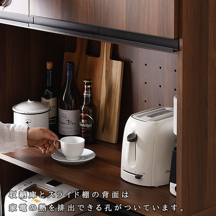 | これ一台でスマートなキッチンが完成するー。暮らしに少し豊かさを加える理想のキッチン収納です。スライド棚や2口コンセントを2か所、さらに大きな収納部分や食器棚、収納棚や引き出しなど、必要なすべてを備えた家電収納です。 上部・下部の収納部分は扉付きですっきり、棚板は調整できるので様々なものを入れられます。 収納庫部分は充分な耐荷重に加え、広さ・高さも余裕のサイズなのでスチームレンジやオーブンレンジなど大き目の家電も設置できます。コード穴やコンセントも付いています。 その他コーヒーメーカーや炊飯器を使う際に便利なスライド棚や、カトラリーなどのこまごましたものを整理するのに便利な引き出しも備わっています。 | |