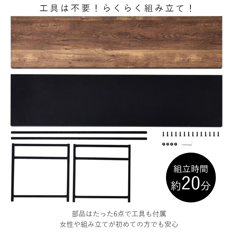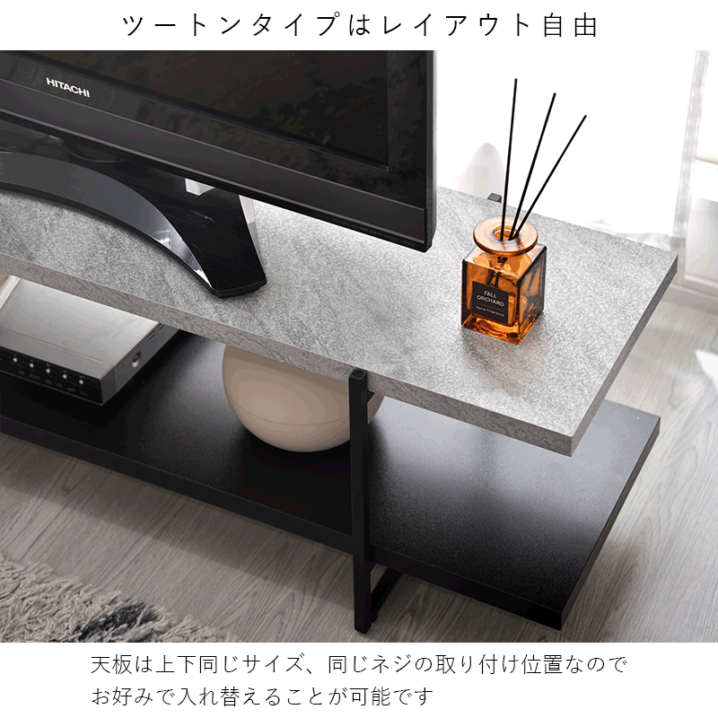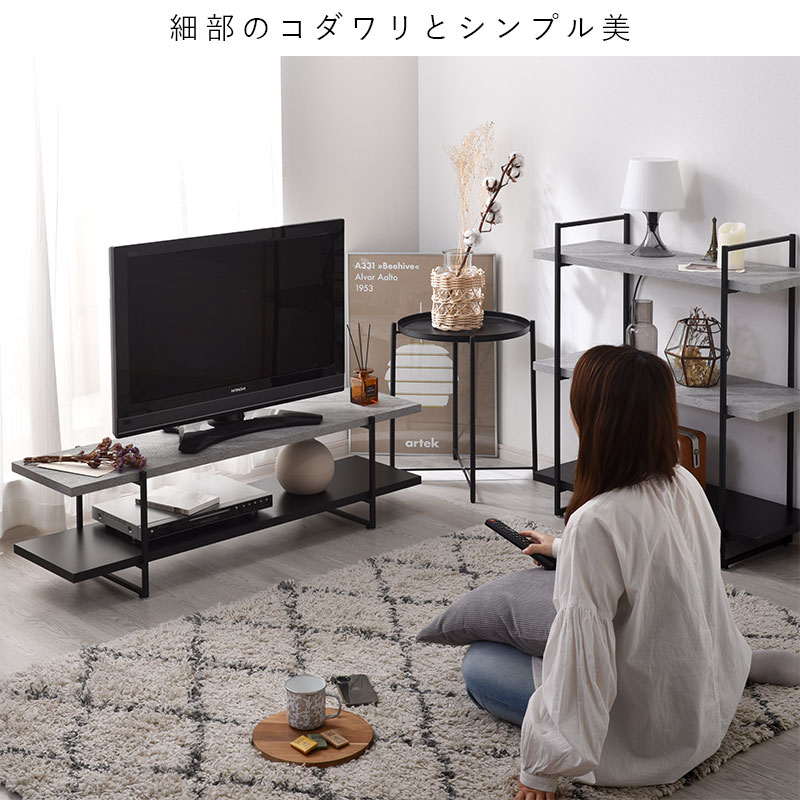 | 木の質感を感じさせる木目調の天板に黒いスチールのフレームを組み合わせた西海岸やブルックリンスタイルに最適なテレビボードになります。 天板と各フレームの6点のパーツをネジで固定するだけ。 大人でしたら20分程度で組み立てられるので組み立てが苦手な方にもオススメです。 上質な木目がリアルに浮き上がり、木の表情が生き生きと見える木目調とスタイリッシュさを強調するストーン調の化粧板を使用しています。 | |