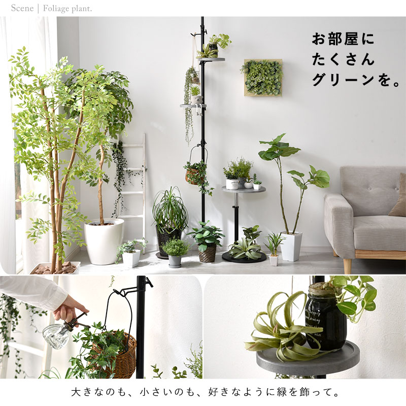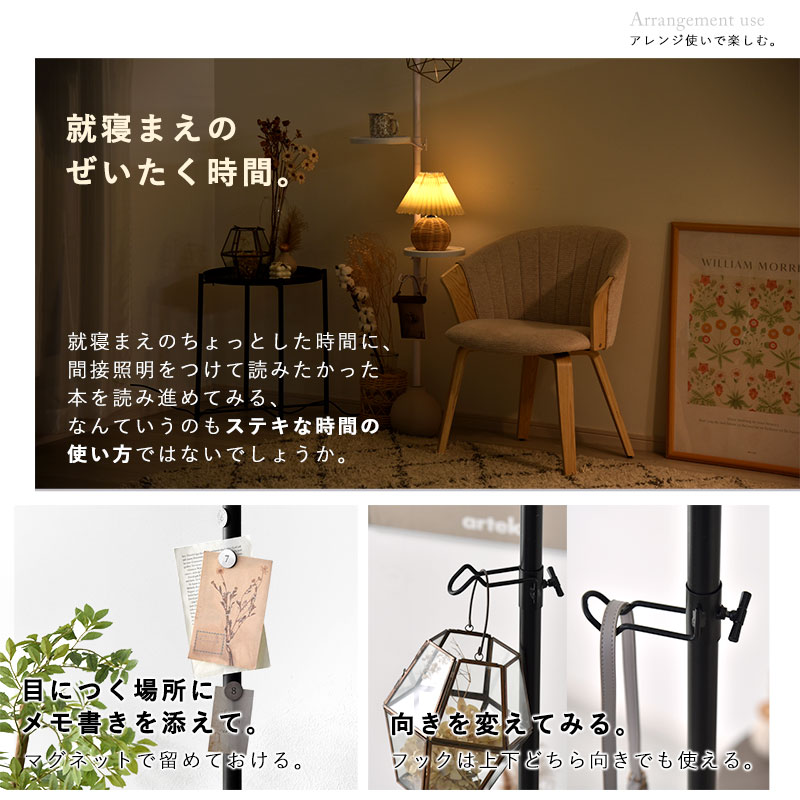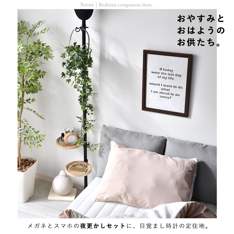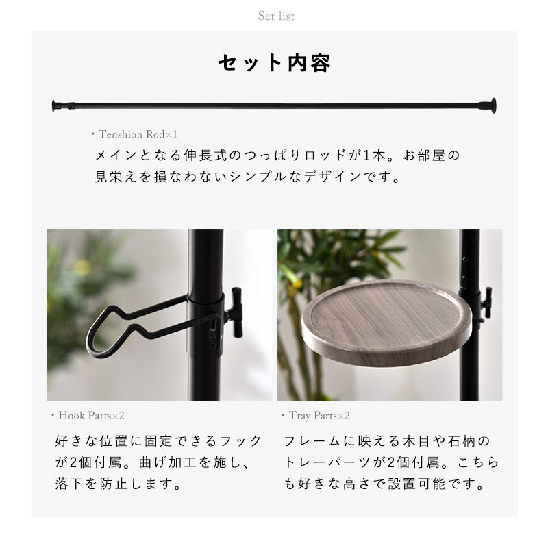 | 限られたスペースでも、おしゃれに自分だけの特別空間を演出する、 突っ張り式のフリーラックが登場です。 一本のテンションロッドに、フックパーツ×2とトレーパーツ×2個がセットになっており、 自在な高さ設定で、自分の好きな位置にセッティングする事が出来ます。 観葉植物を飾ったり、デスクサイドで補助収納として使ったり、 ソファ横でサイドテーブルのようにしたり、ベッド横でないとテーブルのようにしたりと、 お部屋のあらゆるシーンで活躍してくれます。 ブラックフレームやフックパーツは少しざらりとした表情、ホワイトフレームはつるっと滑らかな表情に仕上げています。 トレーパーツにはリアルな木目を再現した塩ビ化粧繊維版を使用し、水や汚れに強く、お手入れも簡単です。 床と天井があれば、お部屋のどこでも使う事が出来る、汎用性の高いおしゃれアイテムです。 | |