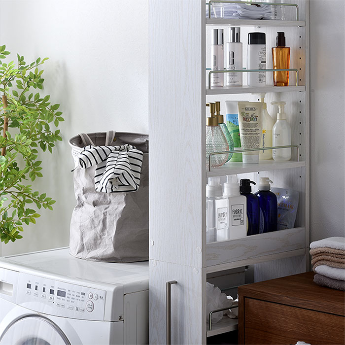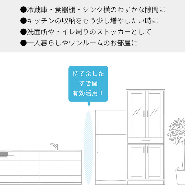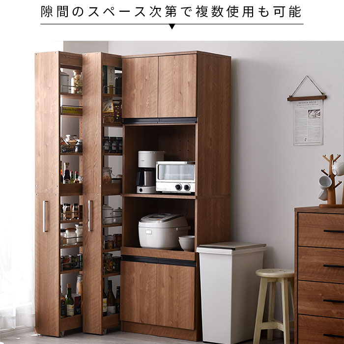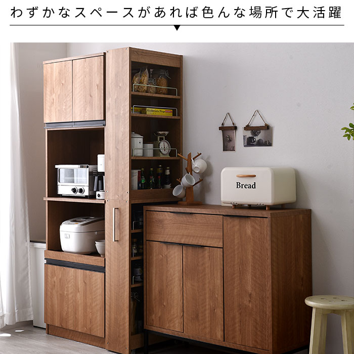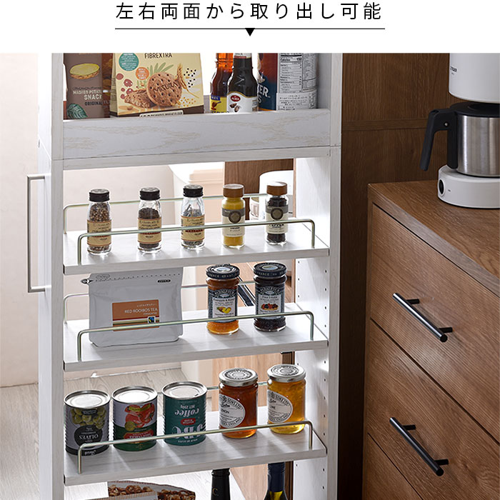 | キッチンのちょっとした隙間に充実した収納スペースを作る隙間収納ラック。 隙間から引き出してサイドから収納したり取り出したりする仕組みで前面からは収納物が見えないのでスッキリとしたキッチン作りに役立ちます。 隙間から引き出すと両面がオープンになっている構造なので左右どちらからでも収納物を取り出せます。 キッチンでの作業もスムーズで快適にできます。 | |