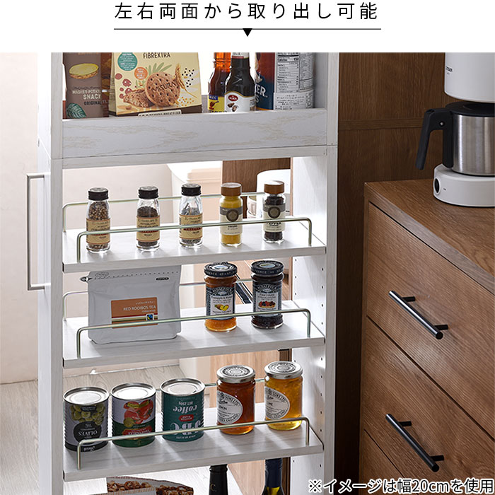 | キッチンのちょっとした隙間に充実した収納スペースを作る隙間収納ラック。 隙間から引き出してサイドから収納したり取り出したりする仕組みで前面からは収納物が見えないのでスッキリとしたキッチン作りに役立ちます。 隙間から引き出すと両面がオープンになっている構造なので左右どちらからでも収納物を取り出せます。 キッチンでの作業もスムーズで快適にできます。 | |