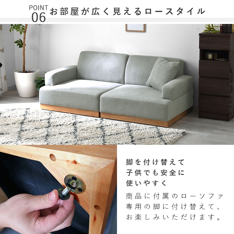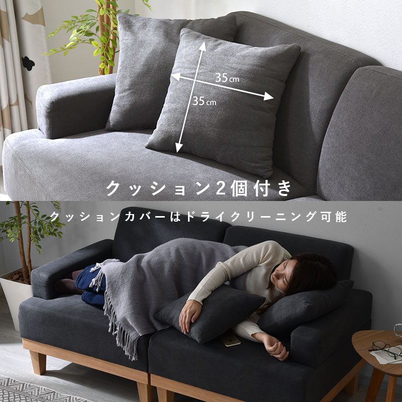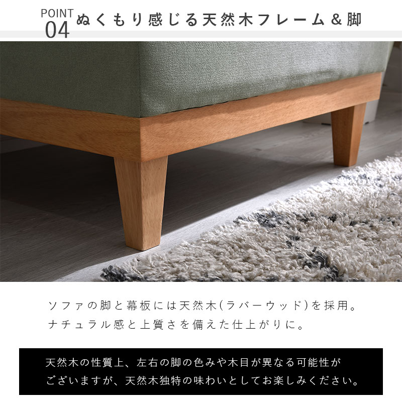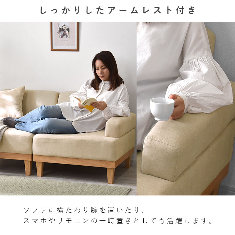 | 並べて2人掛けのソファとしても、分割して1人掛けのゆったりソファとしても。 お部屋のレイアウトや気分によって変えられる、自由度の高いセパレートソファの登場です。 ソファの脚と幕板には天然木(ラバーウッド)を採用。 厚手で高級感あるファブリック生地と相まり、ナチュラルながら上質さを備えた仕上がりで、北欧風のインテリアやナチュラステイストなお部屋にぴったり。 座面はとてもワイド幅。 1人掛け幅74cmと充分な広さがあるのでソファを繋げて2人掛けをしても窮屈感なく、ゆったりとリラックスして座ることができます。 ソファ同士はベルクロ生地を巻き付けて簡単に連結・切り離しができ、ソファを少し離してゆとりある空間や、部屋の角側に置いてコンパクトに収めることもできます。 背面も綺麗な仕上がりになっているので、お部屋でソファの配置を問わずお使いがいただけますよ。 座面はSバネとウレタン入りの5層構造。 底尽きがなくしっかり弾力があり、程よく沈み込む座り心地。身体の重みをきちんと支えてくれます。 また、あぐらをかけるほどの奥行があり、深く腰掛けることができるのもうれしいポイント。 付属の六角レンチで簡単に組み立てができ、届いたその日からお使いいただけます。 ローソファ専用の脚も付属するので、ロースタイルでもお楽しみいただけますよ。 | |