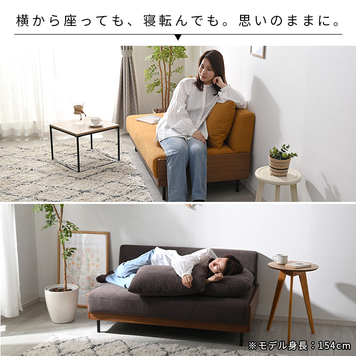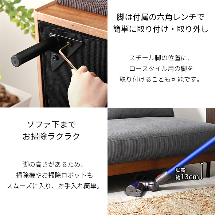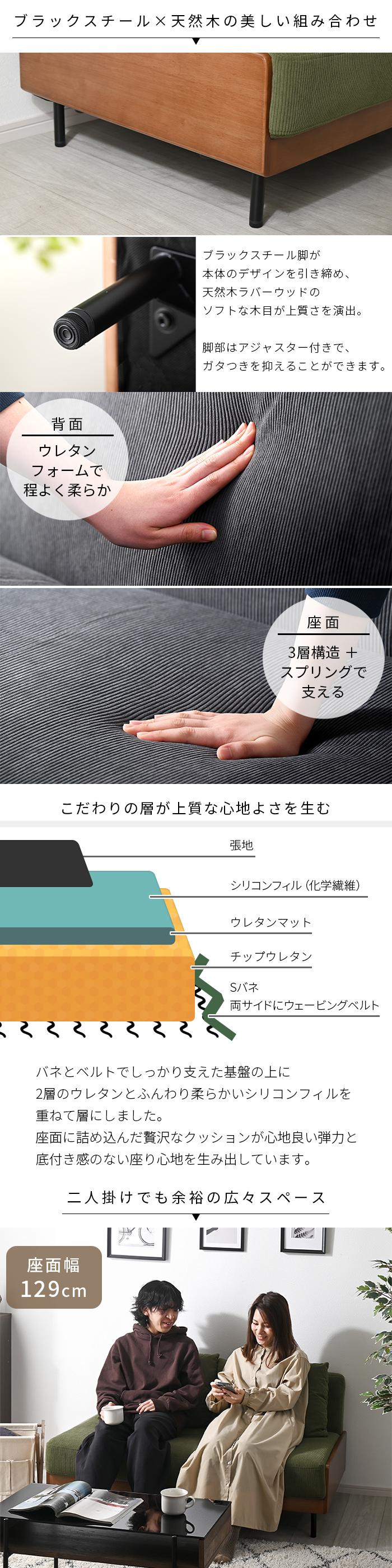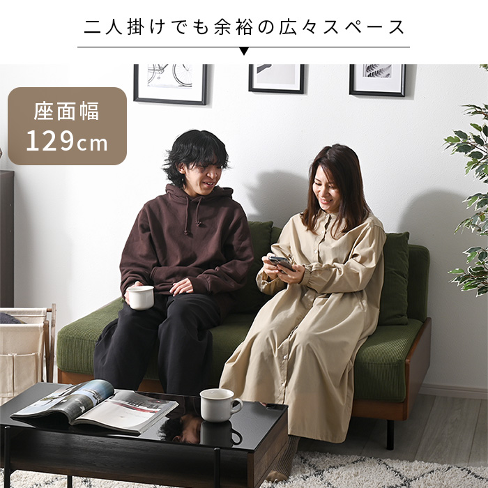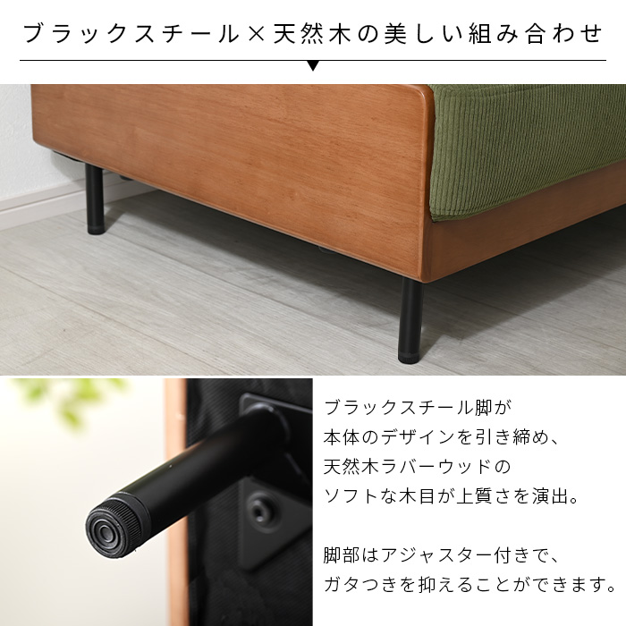 | 天然木ラバーウッドはソフトな印象の木目と滑らかな印象が特徴で座面、背もたれのファブリックとの相性が良い素材です。 脚をブラックスチールにする事でヴィンテージ風に感じさせるオシャレなデザインに仕上がっています。 座面の奥行が深く設計されているのであぐらをかいてくつろぐ事もできます。 肘掛けを無くすことで余白が生まれ、部屋を広く開放的に魅せられます。 二人掛けのちょうど良いサイズとすっきりデザインでワンルームにも◎。 | |