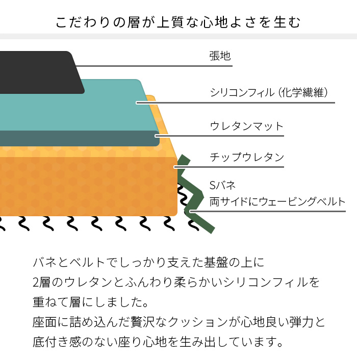 | 商品仕様 | 側板・幕板:天然木(ラバーウッド)(ラッカー塗装) 脚:スチール(粉体塗装) 張り材:ポリエステル クッション材:Sバネ、ウェービングベルト、ウレタン、ポリエステル綿、不織布 |