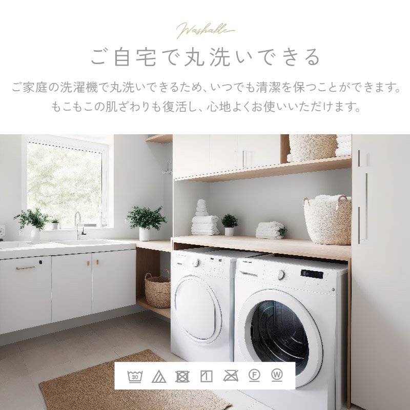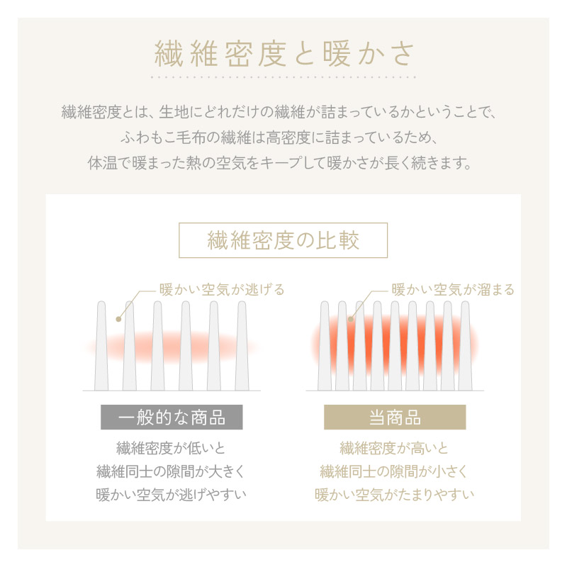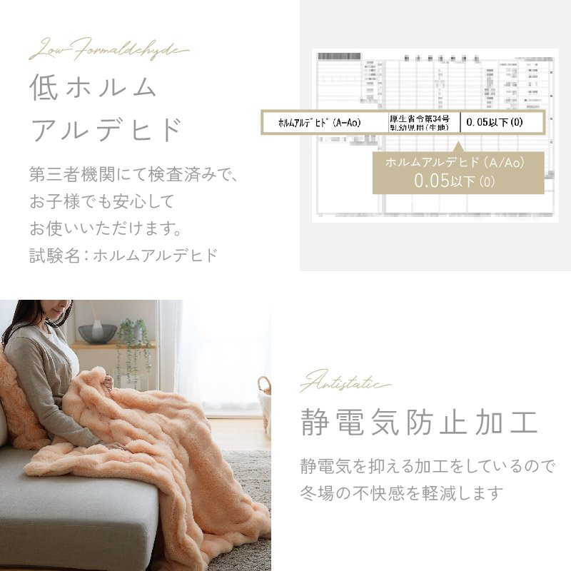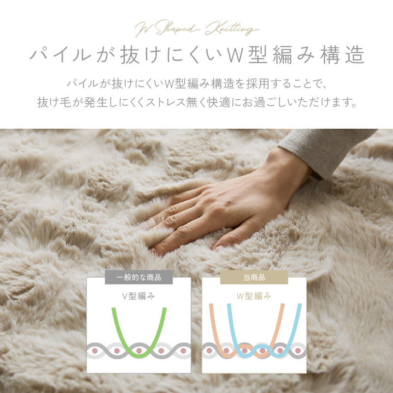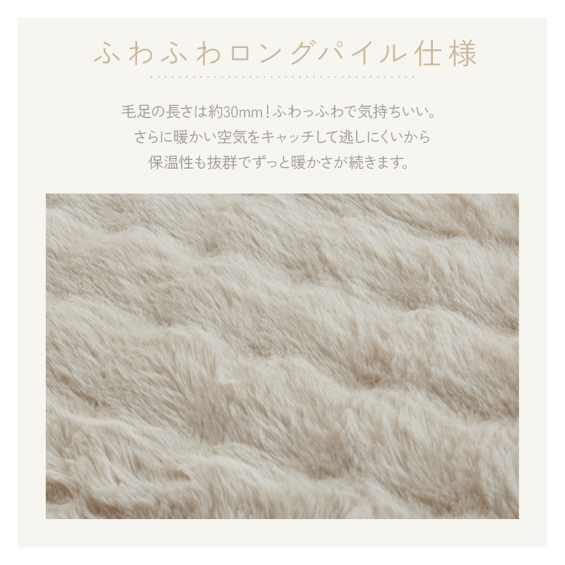 | 触れるたび、心地いい。 包まれるような柔らかさにほっと安らぐ。 疲れて帰ってきた一人の時間も、おだやかな昼下がりに誰かと過ごす時間も、やさしい思い出に。 毎日使うものだから、心地のいいものを選びたい。 柔らかい質感にこだわった、ファブリックシリーズ。 上質でワンランク上のとろけるような新感覚の超なめらかタッチ。 まるでシルクのようになめらかなもこもこ肌ざわりが特長です。 毛足の長さは約30mm!ふわっふわで気持ちいい。 さらに暖かい空気をキャッチして逃しにくいから、保温性も抜群でずっと暖かさが続きます。 パイルが抜けにくいW型編み構造を採用することで、抜け毛が発生しにくくストレス無く快適にお過ごしいただけます(一般的な商品はV型編み、当商品はW型編み)。 目付が480g/m²もあり、高密度だから熱を逃がさずしっかり保温。 空気をため込む層を作り、保温性にも優れています。 裏地はシープタッチのボア生地で柔らかくてあたたかい(※裏地の色は表地と同色)。 ご家庭の洗濯機で丸洗いでき、いつでも清潔を保てます。 もこもこの肌ざわりも復活し、心地よく使えます。 掃除機やコロコロも安心して使えるよう毛羽付着検査に合格し、安心品質を確認済みです(3級以上で合格・5級)。 | |