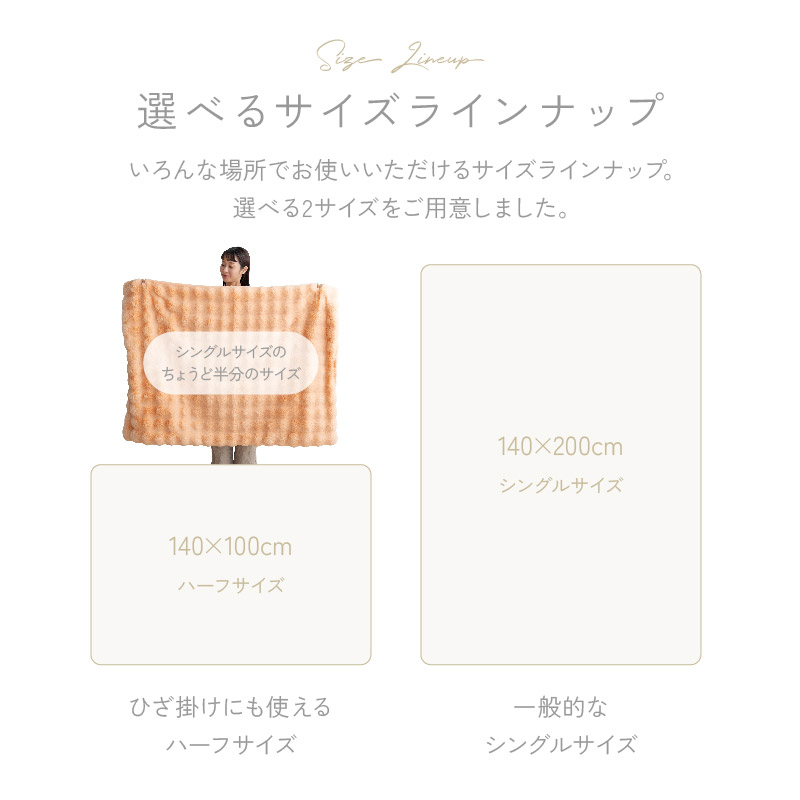 | 取扱タイプ | 100×140/ミルクティー、100×140/ホワイト(白)、100×140/グレー、100×140/オレンジ、140×200/ミルクティー、140×200/ホワイト(白)、140×200/グレー、140×200/オレンジ |