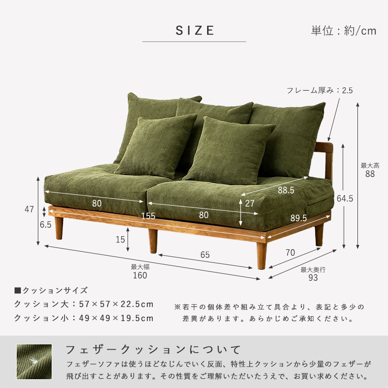 ソファ 2人掛け 2.5人掛け コーデュロイ フェザー おしゃれ 北欧 ソファー 2P 二人掛け 2人 2人掛けソファー コンパクト ワイド ソファベッド ゆったり アームレス 肘なし シンプル ナチュラル 天然木 木製 ファブリック グレー グリーン リビング クッション付き 洗える