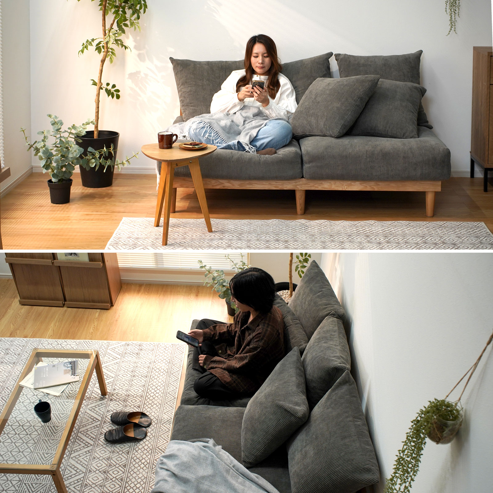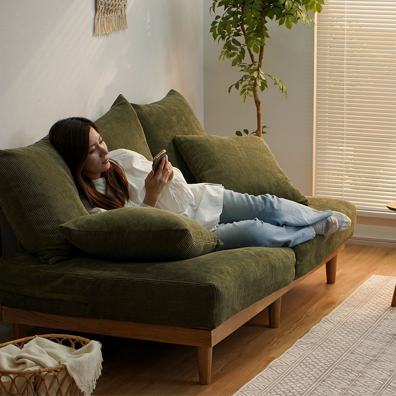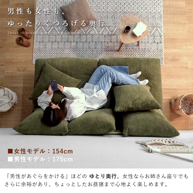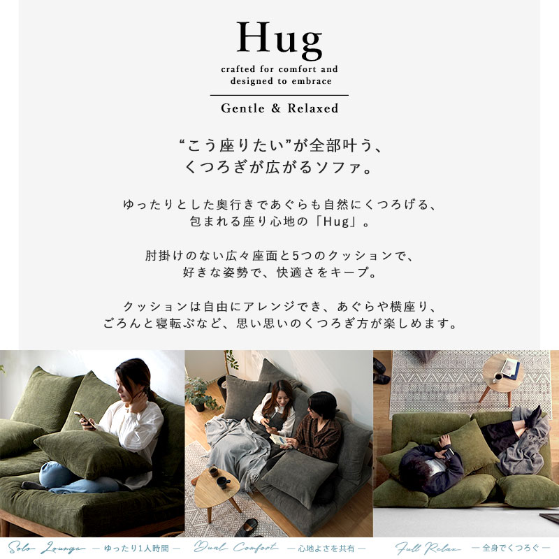 | “こう座りたい”が叶う、くつろぎのあぐらソファ ゆったり奥行であぐらも自然にくつろげる、包まれる座り心地の「あぐらソファ Hug」。 肘掛けのない広々座面と5つのクッションで、どんな姿勢でも快適さをキープ。 クッションは自由にアレンジでき、あぐら・横座り・ごろんなど、思い思いのくつろぎ方が楽しめます。 男女ともにゆったり、あぐらが組める奥行 「男性があぐらをかける」ほどのゆとり奥行で体格を問わず座りやすく、 女性ならお姉さん座りでも余裕があり、ちょっとしたお昼寝にも快適。 あぐらソファを探している方にもおすすめです。 フェザー×シリコンフィルの3層クッション 密度の異なるウレタンにフェザーとシリコンフィルを重ねた3層構造で、 ふんわり包み込みつつ、沈み込みすぎない支えを実現。長時間座っても快適です。 5つのクッションでつくる、自分だけのくつろぎ空間 腰や背中の位置を変えるだけで、自分好みの座り心地に。 読書・スマホ・映画・昼寝など、シーンに合わせて自由にレイアウト可能です。 奥行88.5cmの広々座面で自由な座り方を実現 深く腰掛けても沈み込みすぎず、安定感ある座面が体にフィット。 あぐらも寝転びも思いのまま、心地よいくつろぎを実感できます。 | |