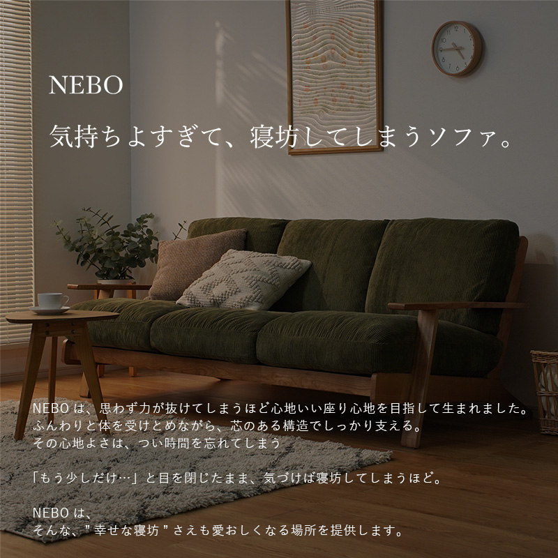 | “気持ち良すぎて、ねぼうしてしまうソファ。 NEBOは、思わず力が抜けてしまうほど心地いい座り心地を目指して生まれました。 ふんわりと体を受け止めながら、ほどよい硬さの座面でしっかり支える。 その心地よさは、つい時間を忘れてしまう「もう少しだけ・・・」と目を閉じたまま、気づけば寝坊してしまうほど。 NEBOは、そんな、“幸せな寝坊“さえも愛おしくなる場所を提供します。 ゆったり寄りかかった瞬間、体にふわっと馴染む心地よさ。背もたれと座面の絶妙な角度が姿勢を自然に導き、長時間でも疲れにくい安定した座り心地を叶えます。 | |