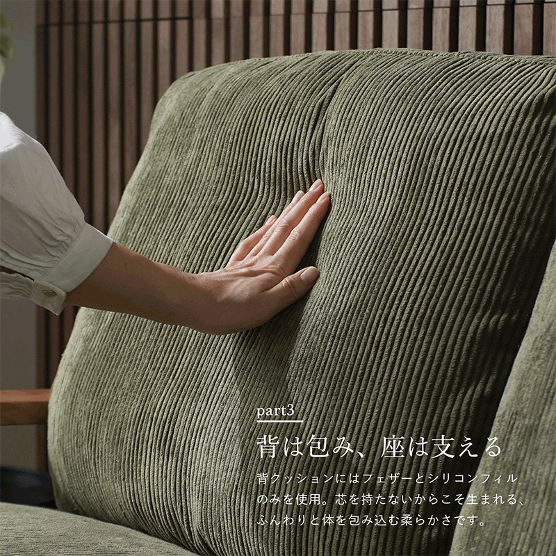 ソファ 3人掛け 3.5人掛け コーデュロイ フェザー おしゃれ 北欧 ソファー 3P 三人掛け 3人 3人掛けソファー アーム付き 肘付き ワイド ゆったり ソファベッド シンプル ナチュラル 天然木 木製 ファブリック グレー グリーン リビング クッション付き 洗える モダン 新生活