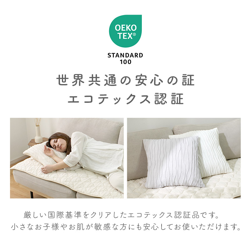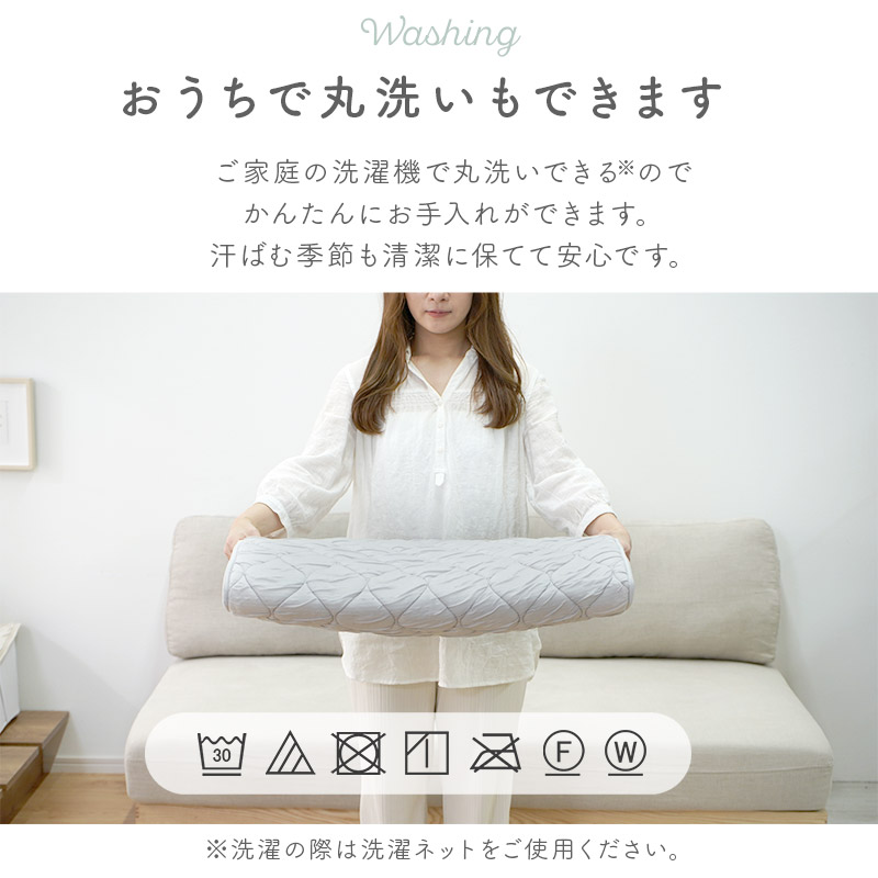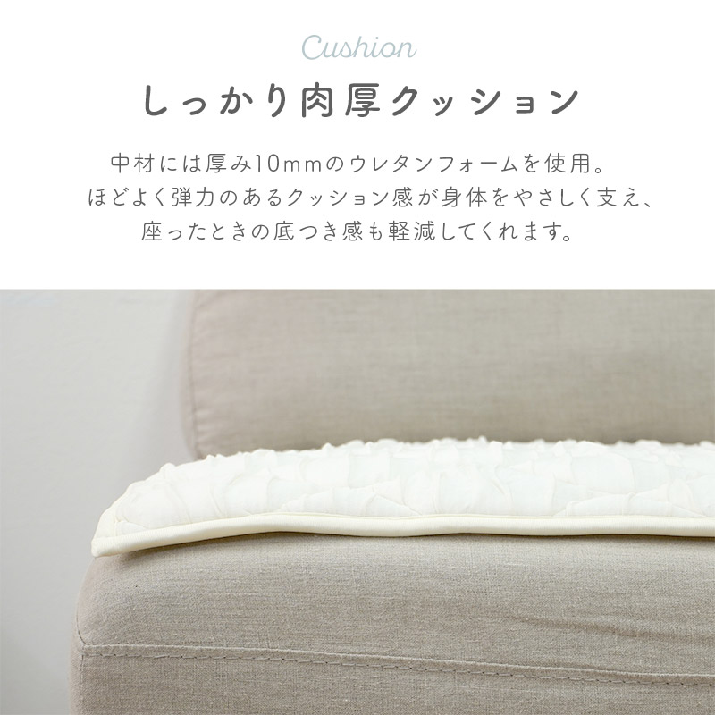 | くしゅっとやわらかな表情で、ソファ時間を心地よく彩るソファパッド。 なめらかでやさしい肌ざわりのレーヨン生地を使用し、さらりと心地よい使い心地に。 不規則に波打つようなくしゅくしゅ感が見た目にもやわらかく、ソファにさっと敷くだけでお部屋に上品なかわいらしさを添えてくれます。 裏面にはフェイクスエード生地を使用し、気になるズレを軽減。 中材には厚み10mmのウレタンフォームを入れているので、ほどよいクッション感があり、ごろ寝やくつろぎ時間にもぴったりです。 さらに、抗菌防臭わたを使用しているので清潔に使いやすく、ご家庭で丸洗いできるのもうれしいポイント。 見た目のかわいさと使いやすさを兼ね備えた、毎日に取り入れやすいアイテムです。 | |