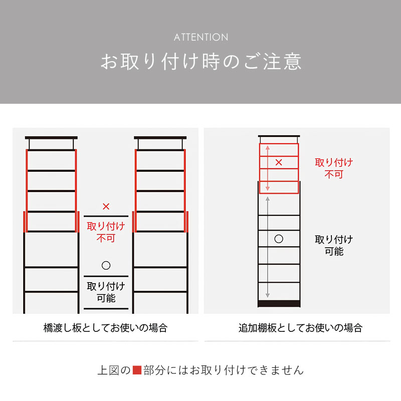 | 「突っ張り本棚 スラスト」をさらに便利に使える、専用の追加棚板です。 「橋渡し棚板」「ジョイント棚板」としても使用でき、本棚の拡張性を大きく高めます。 本棚と本棚の間に取り付ければ、壁面収納の幅が広がり、収納量が大幅アップ。 コミック・文庫本・雑誌・小物など、カテゴリーを問わず効率よく収納できます。 また、背の低いアイテムを収納して上部がデッドスペースになっている場合、この追加棚板を設置することで、空間を無駄なく活用できます。 限られたスペースでも収納力を最大化したい方に最適です。 | |