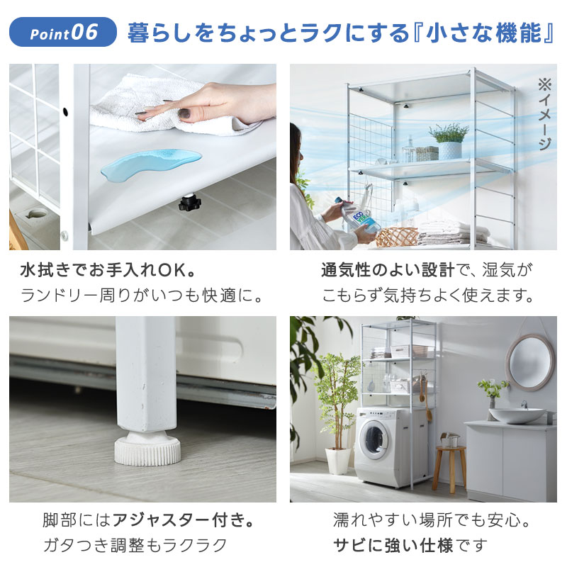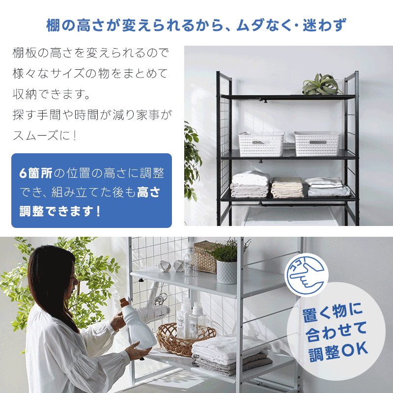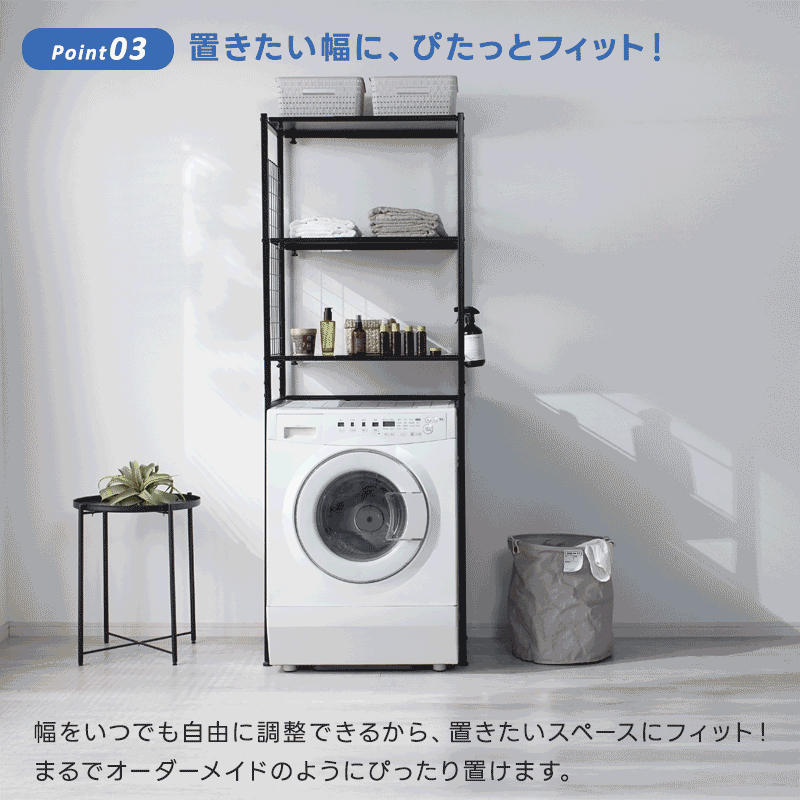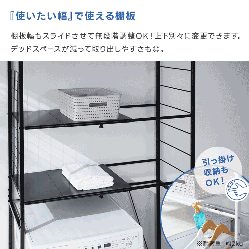 | シンプルでオシャレ、そして洗濯機まわりの収納を増やしてくれる洗濯機ラックです。 幅が無段階で伸縮するタイプなので、お使いの洗濯機の幅に合わせて設置したり、または幅をふやして収納スペースを増やしたりと、お好きな幅でオーダーメイドのように調整することができます。 天板や棚板もそれにあわせスライドで伸縮させられるので、幅にあわせて調整し、短くして収納を増やしたり支柱をハンガーがわりに使ったりと様々な使い方ができます。 左右は形状の違うフレームになっていて、左右どちらにもお好みで取り付けが可能。お手持ちのハンガーやS字フックでちょい掛け収納ができるメッシュフレームとタオル掛けなどにも使えるラダーフレームです。 また、シンプルながら横揺れに強い頑丈な補強バーも備えており、安心してご利用いただけます。 | |