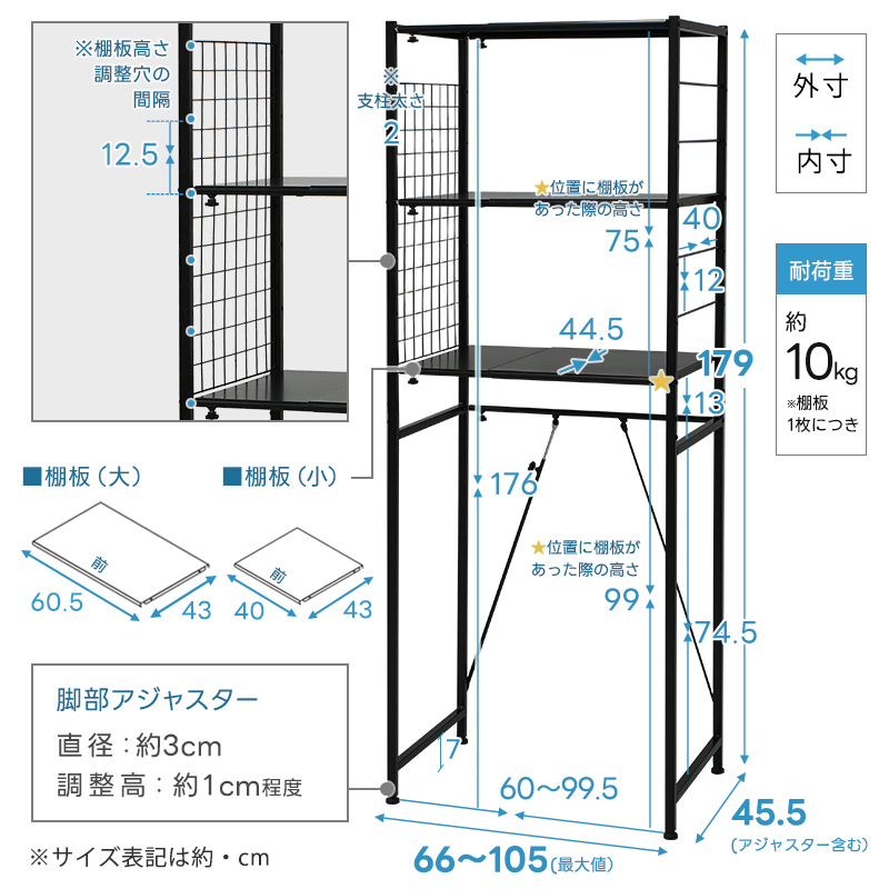 | 商品サイズ | 外形寸法:(約)幅65〜104cm×奥行き44.5cm×高さ179cm 外形寸法(最大値):(約)幅66〜105cm×奥行き45.5cm×高さ179cm |