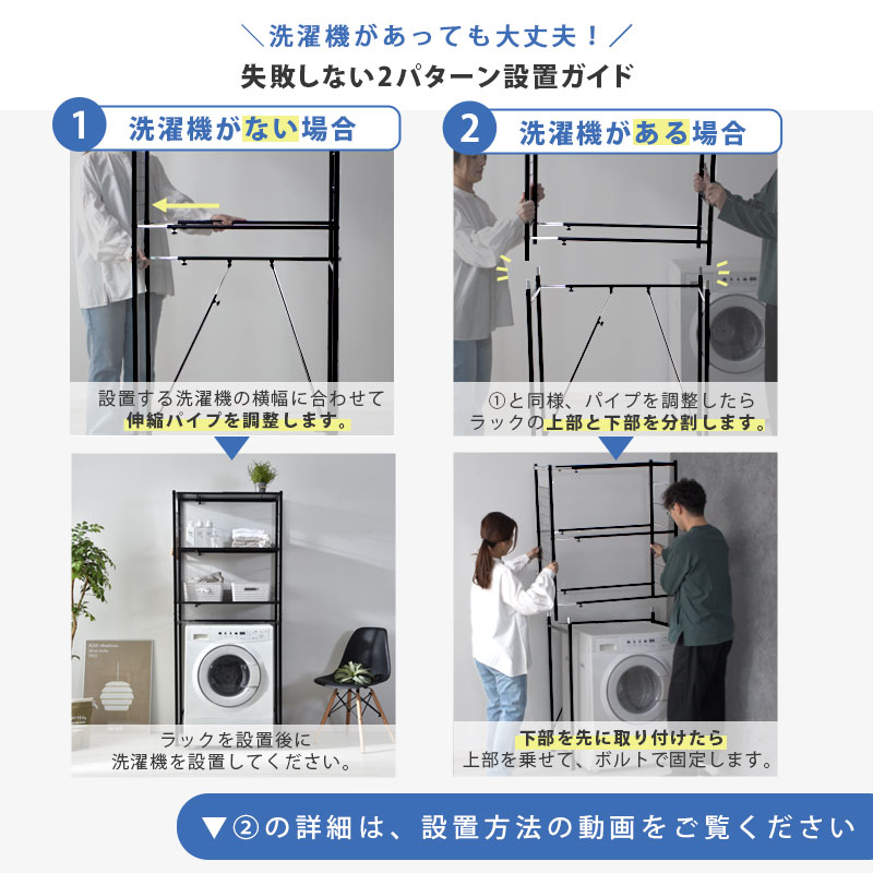 幅が無段階で伸縮するタイプなので、お使いの洗濯機の幅に合わせて設置したり、または幅をふやして収納スペースを増やしたりと、お好きな幅でオーダーメイドのように調整することができます。