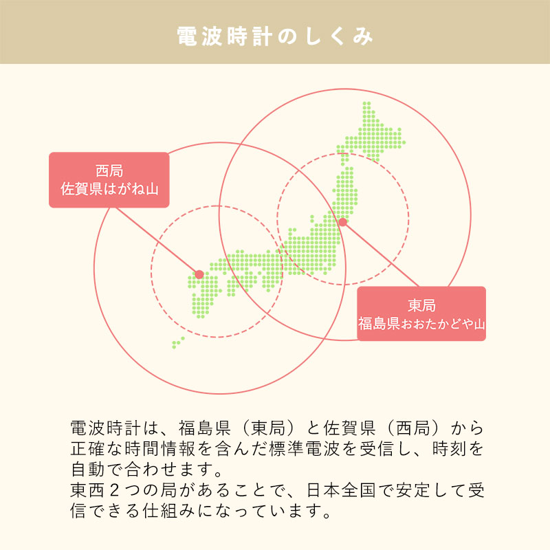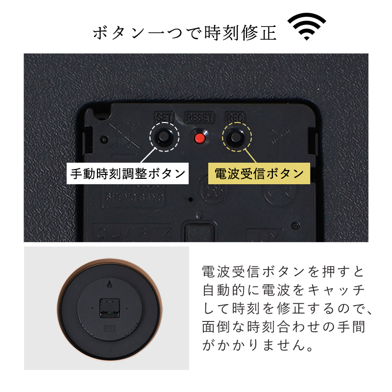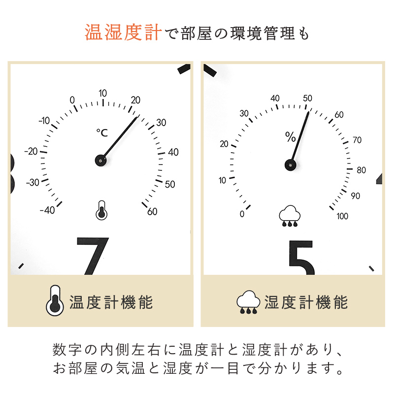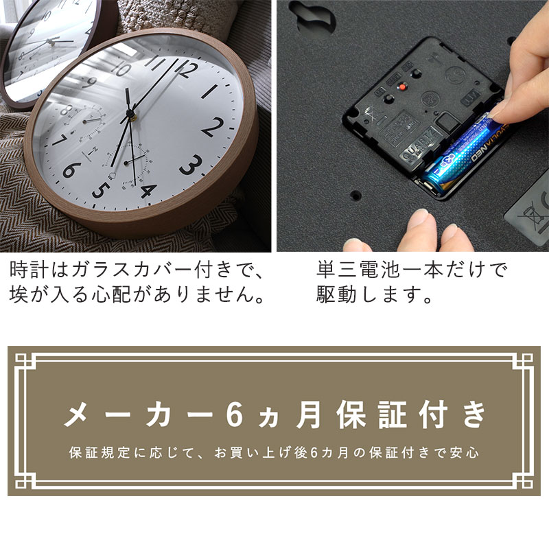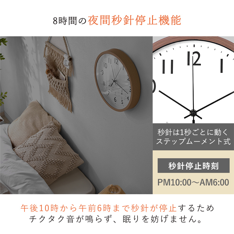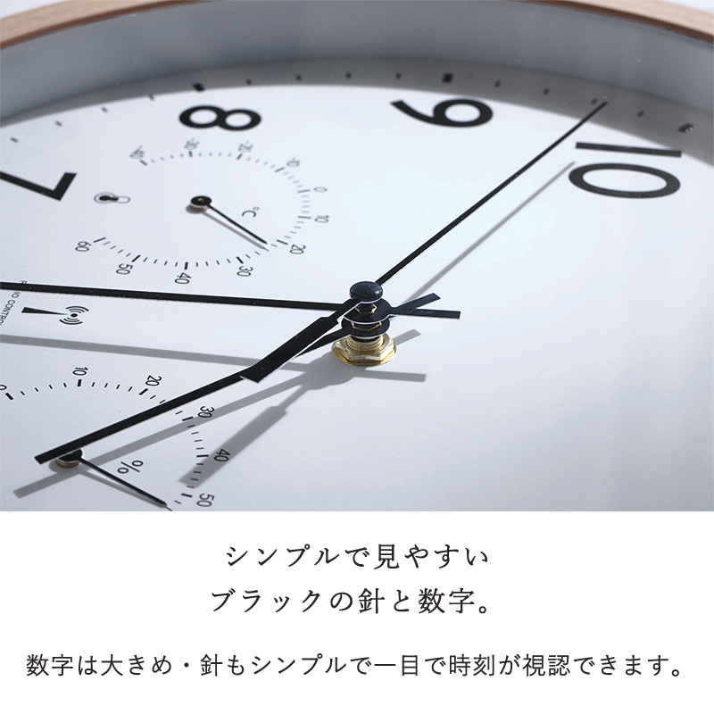 | シンプルで心地よい使いやすさ。 正確な時間を刻む電波式の掛け時計 自動で時刻を合わせてくれる電波式なので時刻合わせ要らずで、いつでも正確な時間を示してくれます。 また、夜間秒針停止機能がついており午後10時から午前6時まで秒針が停止するためチクタク音が鳴らず、眠りを妨げないのもうれしいポイント。 数字の内側左右に温度計と湿度計があり、お部屋の気温と湿度が一目で分かります。 | |