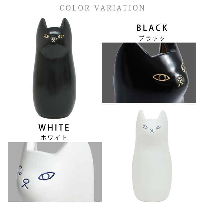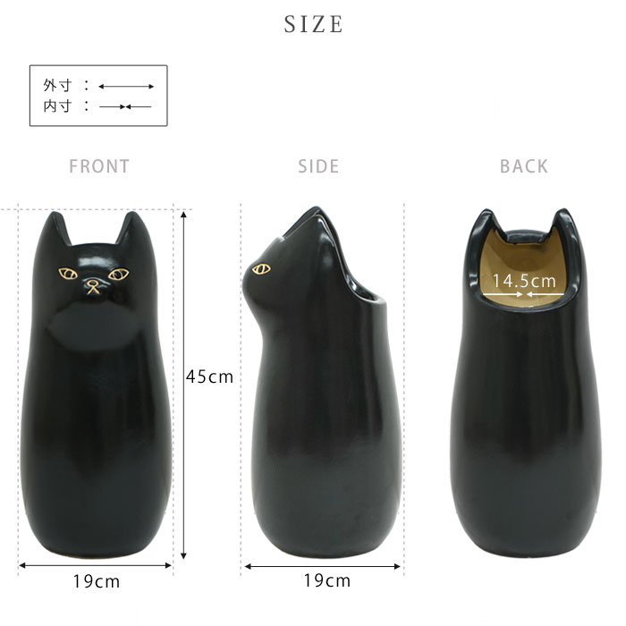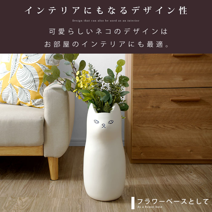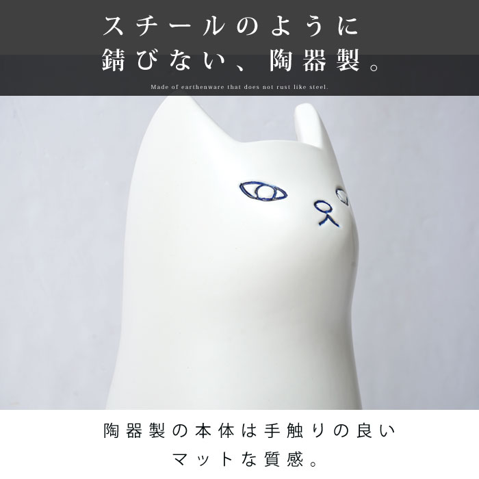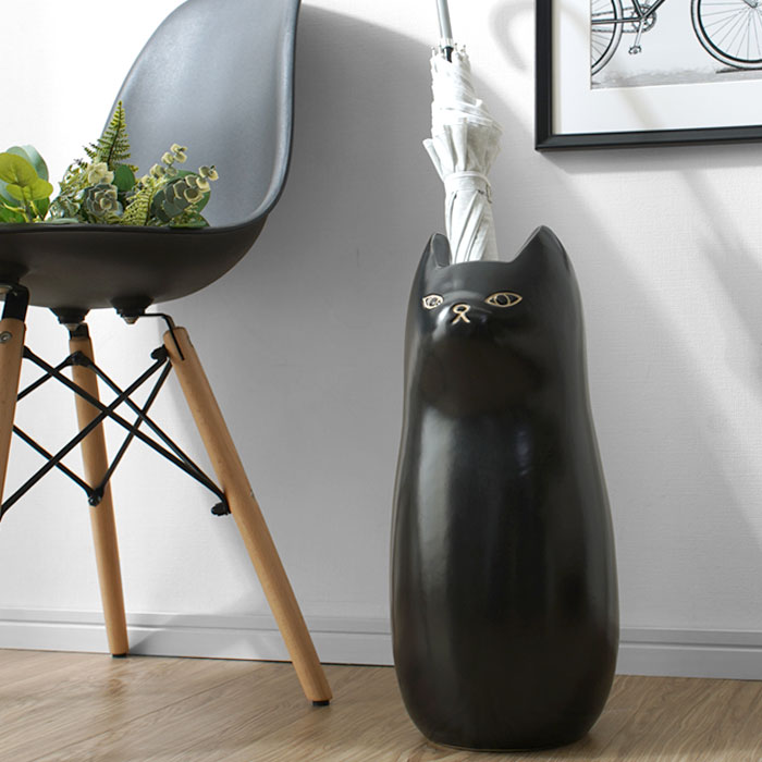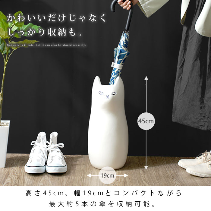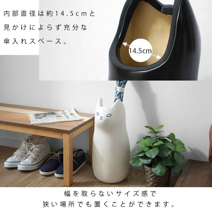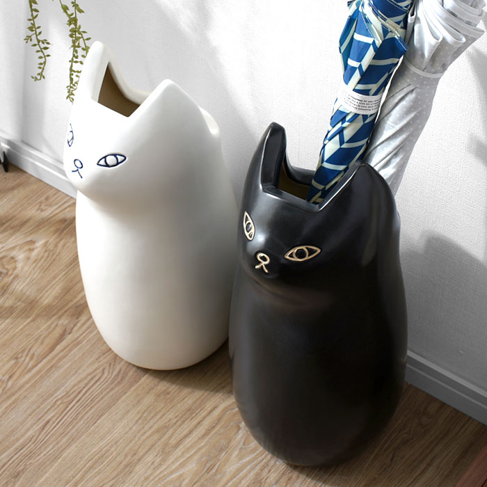 | きゅっと結んだおくちと、ぽってりとしたフォルムが愛らしい。 置くだけで可愛い、陶器製のねこの傘立て「ナスカ」の登場です。 陶器製の本体は、手触りの良いマットな質感。よくあるスチール製の傘の様に錆びる心配をせずお使いいただけます。 もちろん可愛いだけではなく、しっかりと傘を収納してくれます。 高さ45cm、幅19cmとコンパクトながら最大5本の傘を収納可能。 幅を取らないサイズ感で、狭い場所でも置くことができます。 玄関だけじゃもったいない愛らしさなので、ポスター入れとして使ったり、フラワーベースとして使うなどお部屋のインテリアとしてつかうのもお勧め。 ナチュラル感がある白ねことモダンな部屋に似合いそうな黒ねこの2カラーから、あなたのお好みで選べます。 | |