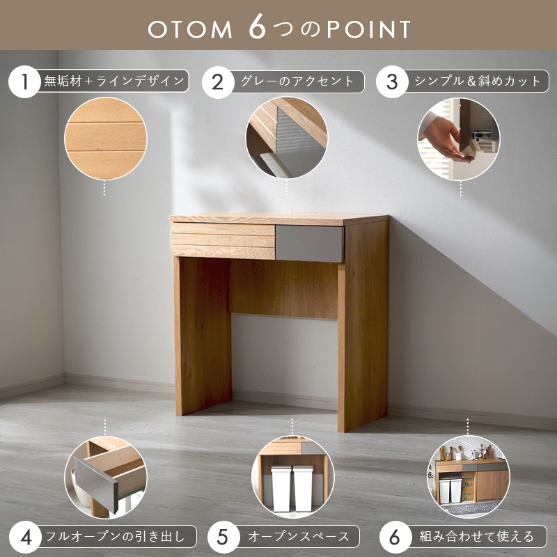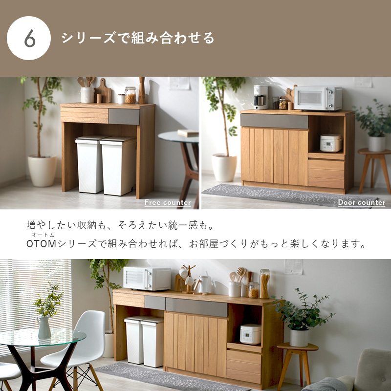 | オーク無垢材を使った木目の美しさに、落ち着いたグレーのアクセントが映えるOTOMシリーズのフリーカウンター。 取っ手をなくしたシンプルなデザインに、扉上の斜めカットを取り入れ、シンプルさと機能性を両立しました。 下部はオープンスペースになっており、ゴミ箱を並べたり、スツールを収めたり、ペットボトルのストック置きなどにも活躍。 天板上は作業やディスプレイにも使え、省スペースで便利に暮らしを整えられます。 シリーズで揃えれば空間全体に統一感が生まれ、より快適なインテリアに。日本製・大川家具の完成品で、届いたその日から安心してお使いいただけます。 | |