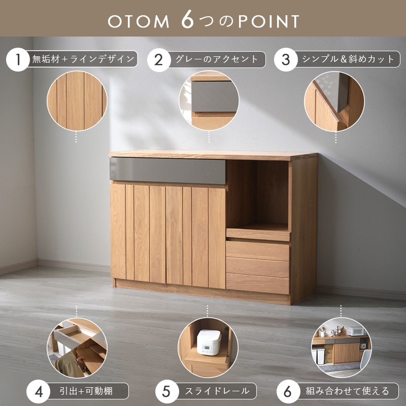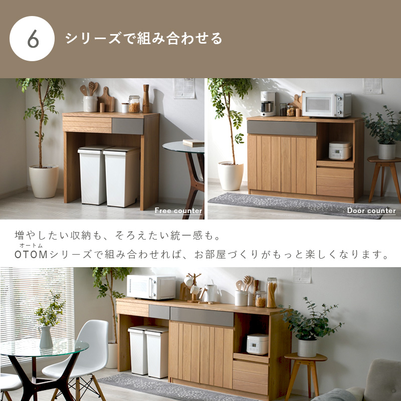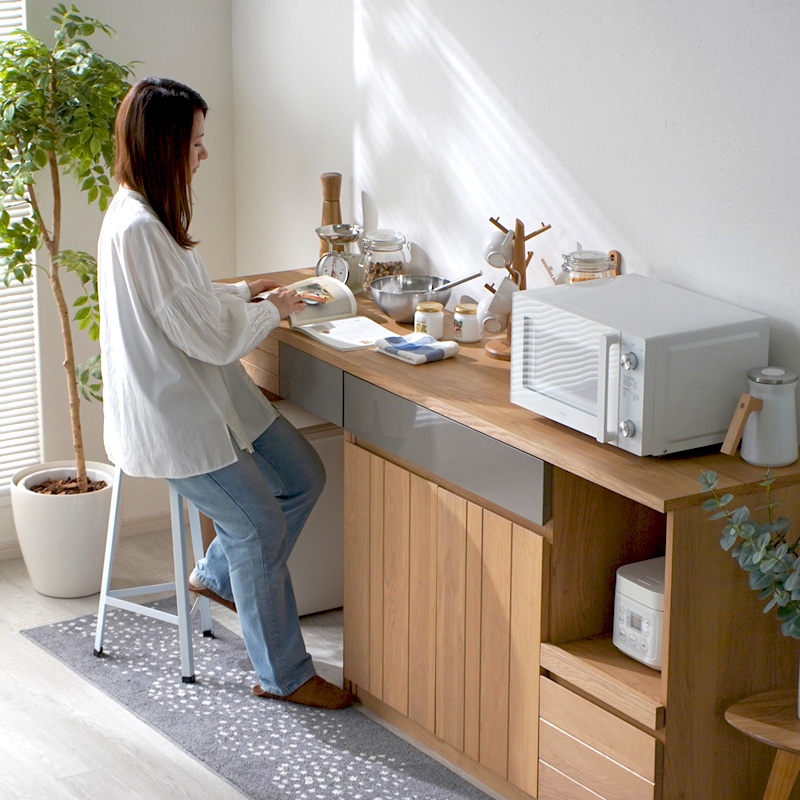 | オーク無垢材を贅沢にあしらった前板と、上品なグレーのアクセントが目を引くOTOMシリーズのドアカウンター。 すっきりとしたデザインに扉上の斜めカットを加え、シンプルでありながら使いやすさにもこだわりました。 電子レンジやコーヒーメーカーを置けるオープンスペースと、大容量の収納を組み合わせたつくりで、毎日の料理や片付けを快適にサポート。 引き出しは奥まで取り出しやすいフルオープン仕様で、湿気に強い桐材を使用。調理器具や食品のストックも安心して収納できます。 シリーズで揃えれば統一感のあるキッチンに。 日本製・大川家具の完成品で、すぐに快適にご利用いただけます。 | |