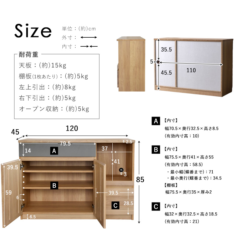 | 耐荷重 | 天板:(約)15kg 可動棚:(約)5kg オープン収納:(約)5kg 大引出:(約)8kg 小引出:(約)5kg 扉内収納:(約)5kg |