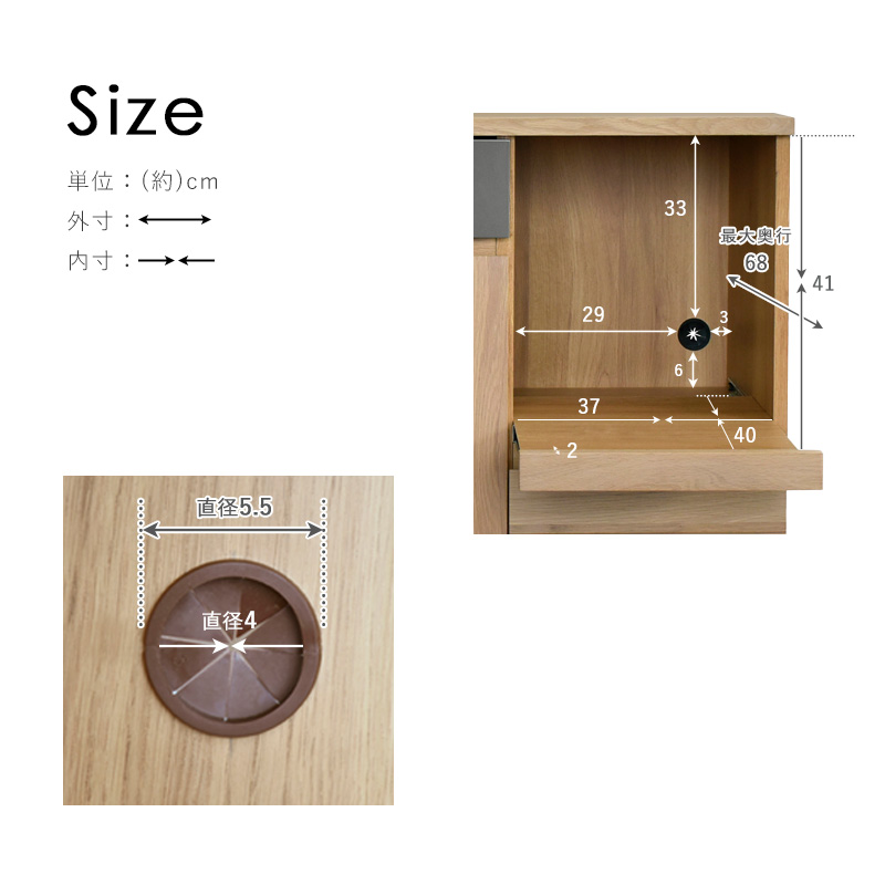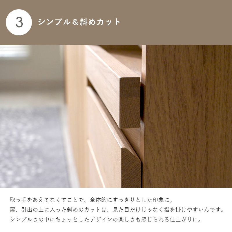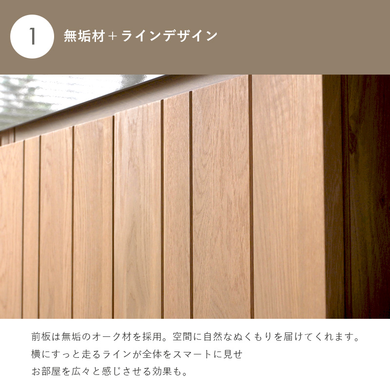 | 商品仕様 | 天板:強化紙化粧繊維板 前板:オーク無垢材(オイル塗装)、MDF(エナメル塗装) 本体:プリント紙化粧繊維板(裏化粧無し) |