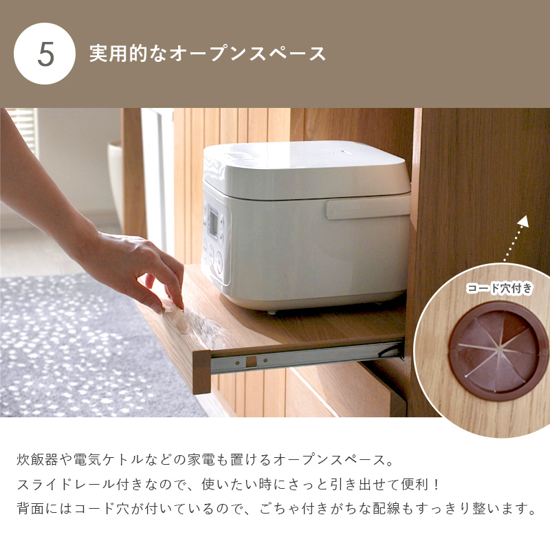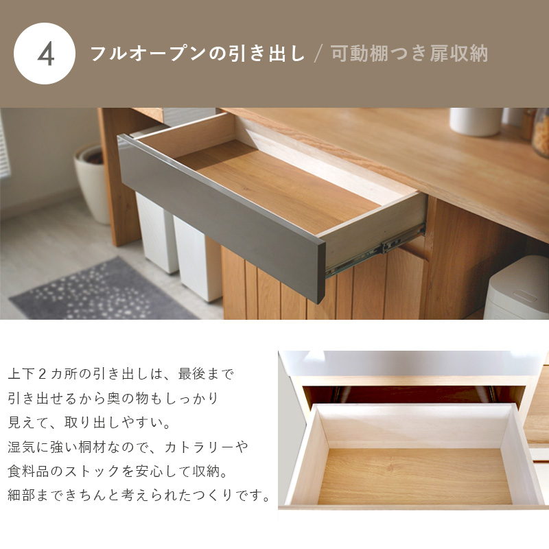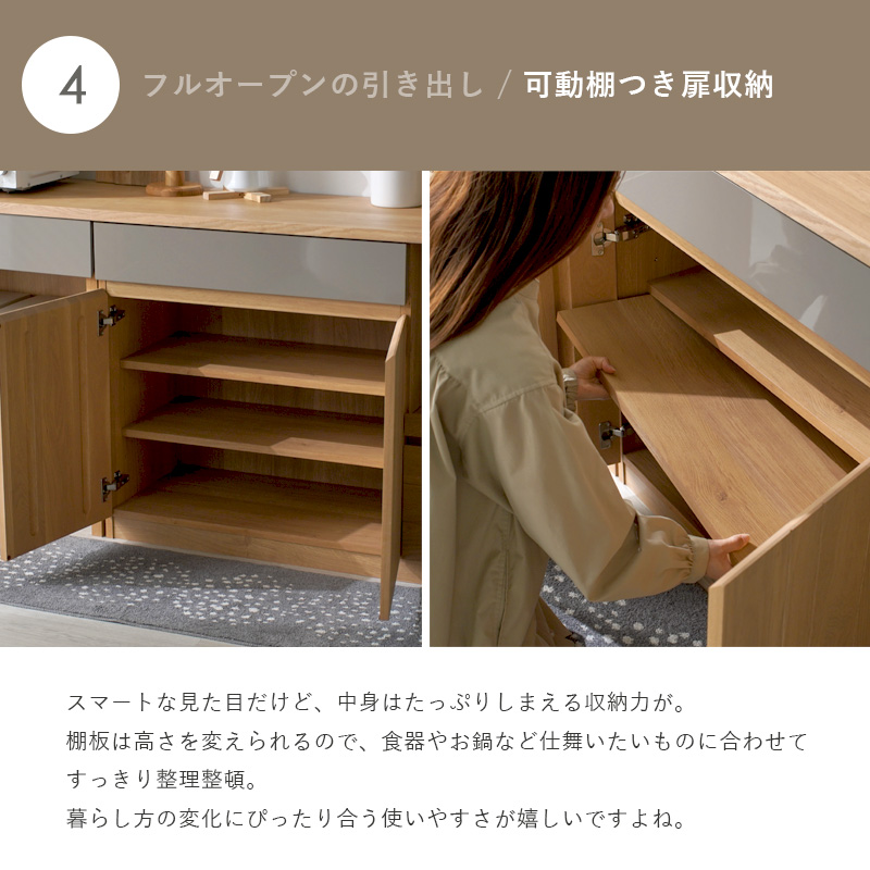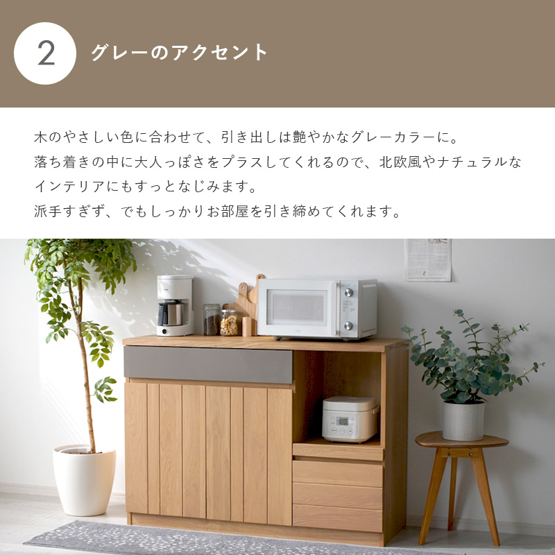 日本製 国産家具キッチンボード レンジ台 ロータイプ 幅120cm 引き出し スライド棚 収納棚 食器棚 ラック 間仕切り 台所 ナチュラル 北欧 モダン 木目 作業台 キッチン収納 炊飯器 電子レンジ 家電収納 レンジボード オートム 120ドアカウンター ガルト大川家具