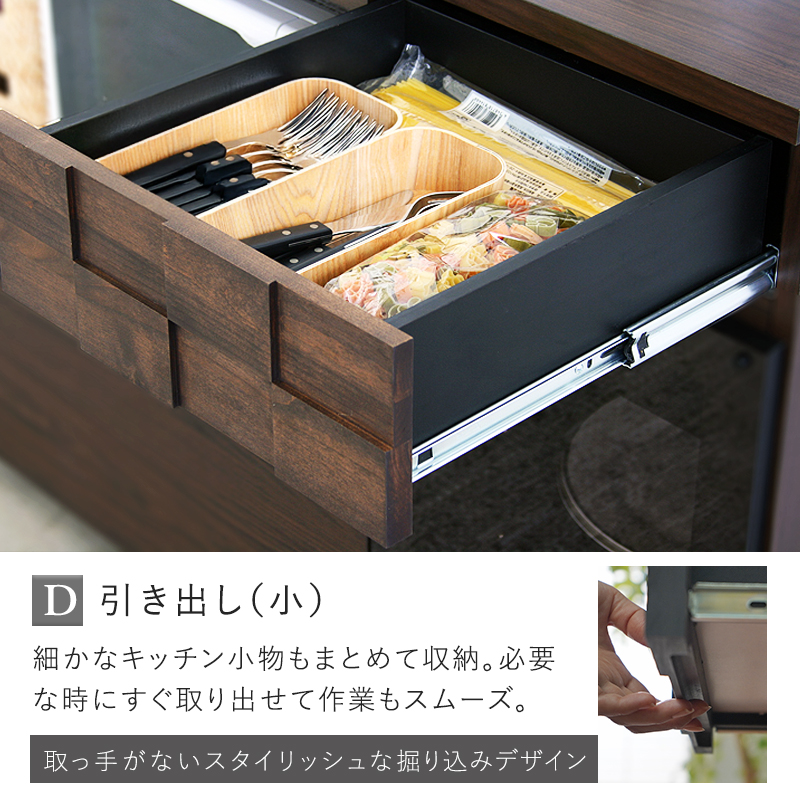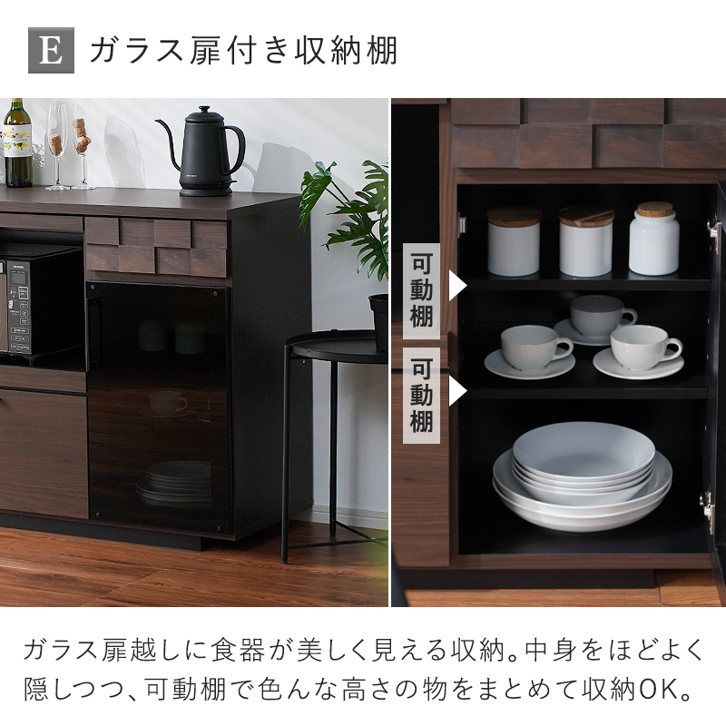 | 天然木とガラスを活かした上質なキッチンカウンター。天然木とブラックガラスが織りなす落ち着いた佇まい。実用性も兼ね備え、暮らしにゆとりを生み出します。 作られた日本製の大川家のこだわりを随所に感じられるインテリア。 5つの便利機能。見た目も使いやすさも兼ね備えた一台 幅120cmの幅広天板は作業台としても使え下のスライドトレーで作業にゆとりが生まれます。二口コンセントがついた幅広のスライド棚付き家電収納庫に加え、引き出しやガラス扉など、機能的な収納部分に加えて天然木のアルダー材で作られた格子デザインが目をひきます。 シリーズで揃えると統一感が出てすっきりと整った空間になります。 | |