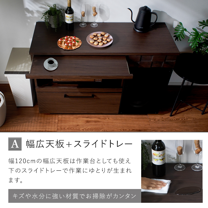 コルク 幅120cm スライド棚付きキッチンカウンター