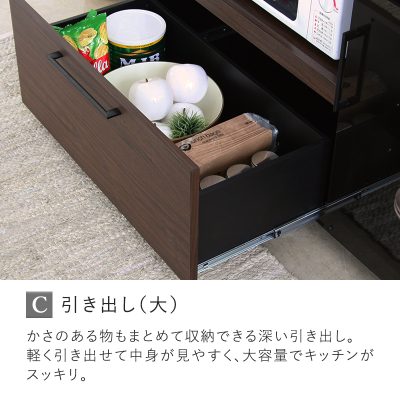 | 耐荷重 | 天板:(約)15kg 棚板:(約)5kg スライド棚:(約)10kg 引き出し(小):(約)3kg 引き出し(大):(約)8kg |