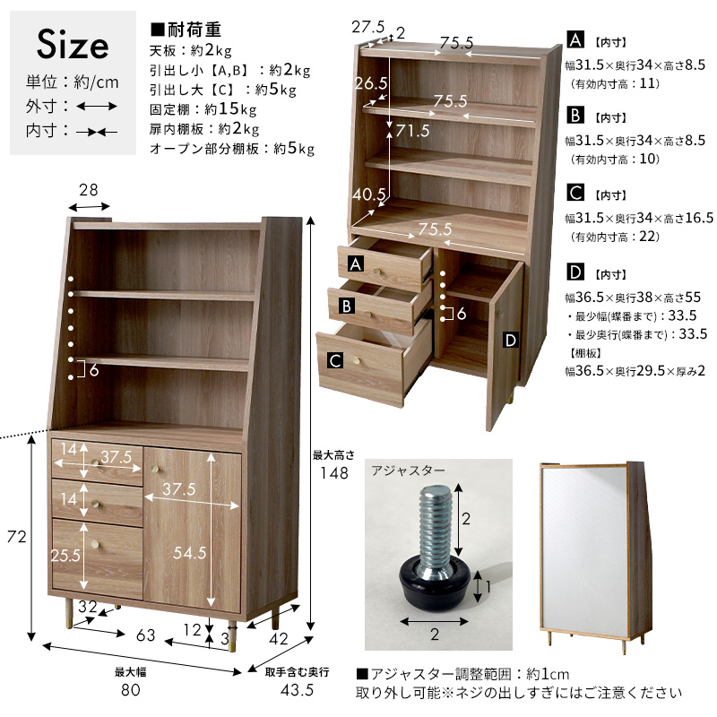 | 耐荷重 | 天板:(約)2kg 引出し小:(約)2kg 引出し大:(約)5kg 固定棚:(約)15kg 扉内棚板:(約)2kg オープン部分棚板:(約)5kg |