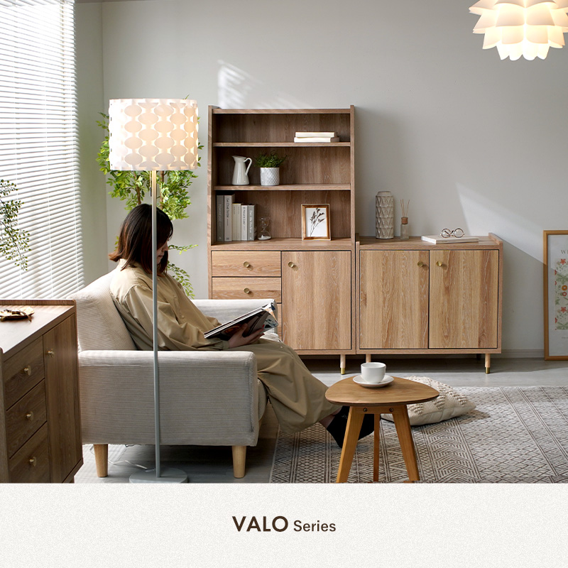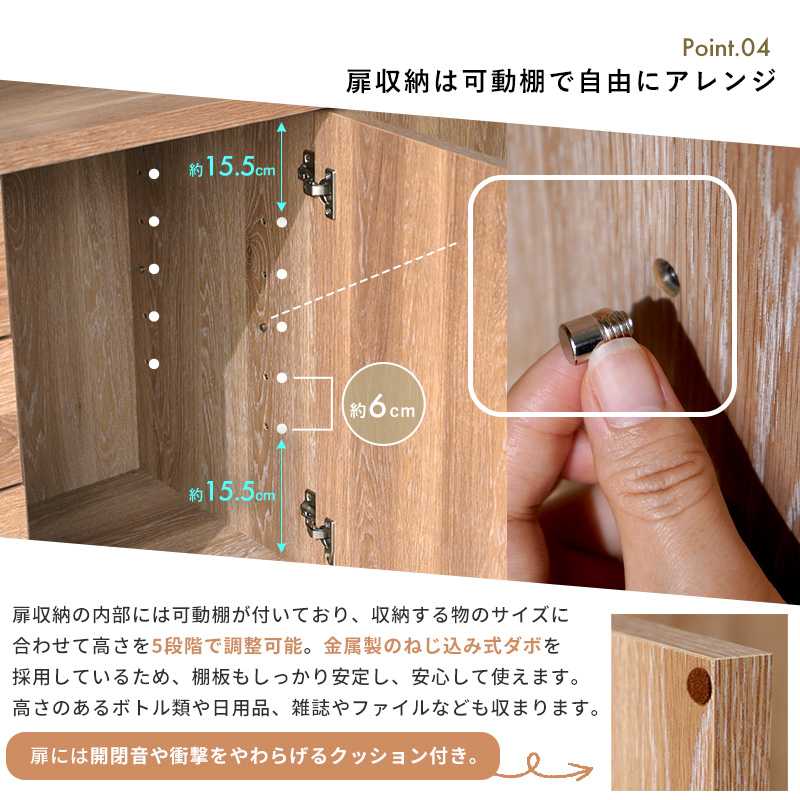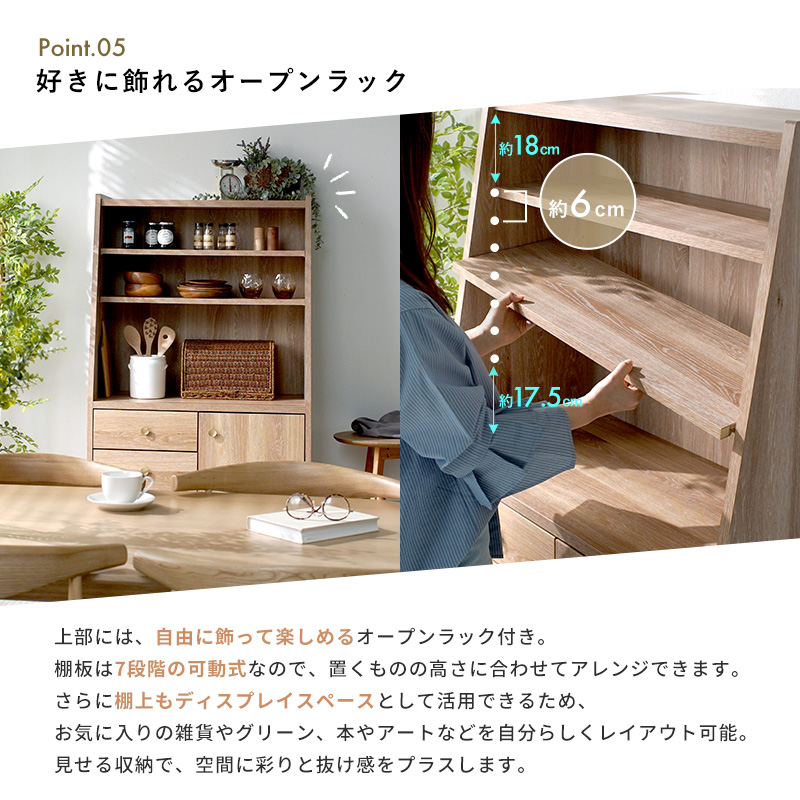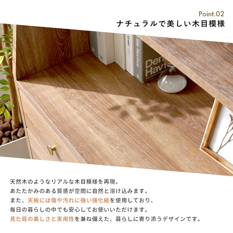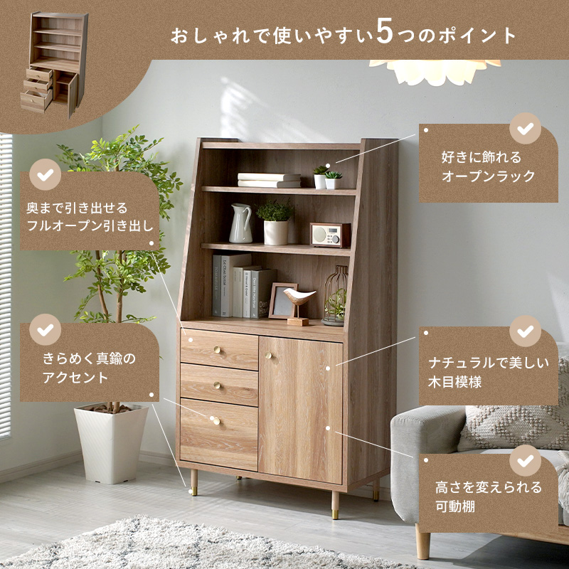 | さりげないこだわりが、心に残る。 時を重ねて味わいが増す、真鍮のつまみが印象的なキャビネットシェルフ。 オープンラック・引き出し・扉収納をバランスよく組み合わせ、見せる・隠すの両立を叶えました。 内部は可動棚仕様で、高さのある物もすっきり収納。 引き出しには調湿性に優れた桐材を使用し、衣類や小物も安心です。 天板は傷や汚れに強い強化紙仕上げで、日常使いにもぴったり。 脚付きでお掃除ロボットも使いやすく、アジャスター付きでがたつきも防ぎます。 ななめカットのデザインが空間に圧迫感を与えず、軽やかな印象に。 背の高い収納でありながらすっと馴染んでくれるのはこのやさしいフォルムのおかげです。 ナチュラルで落ち着いた佇まいは、リビングやキッチンにも自然に溶け込みます。 | |