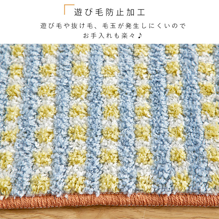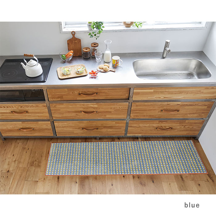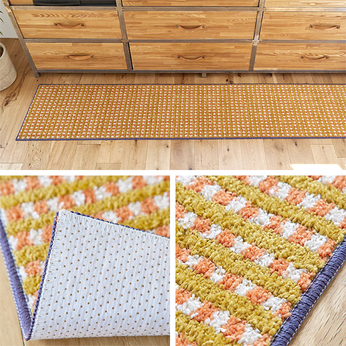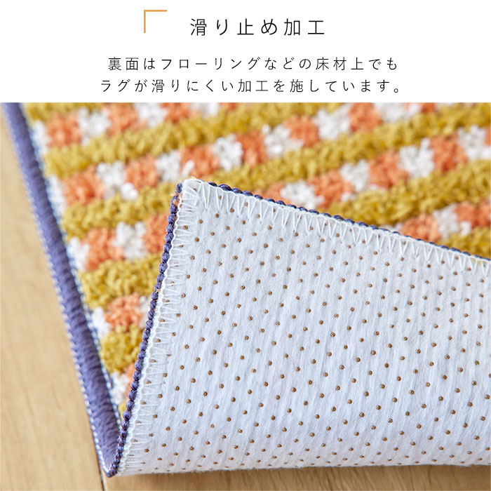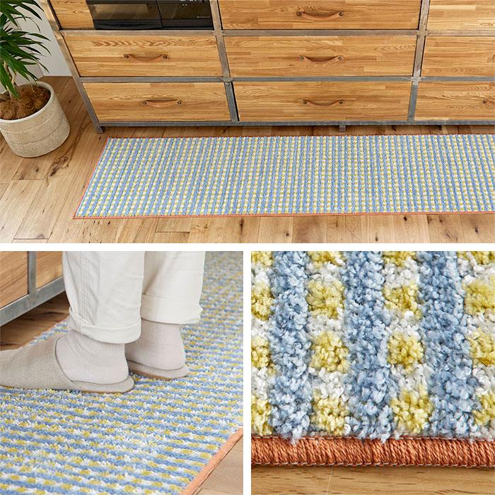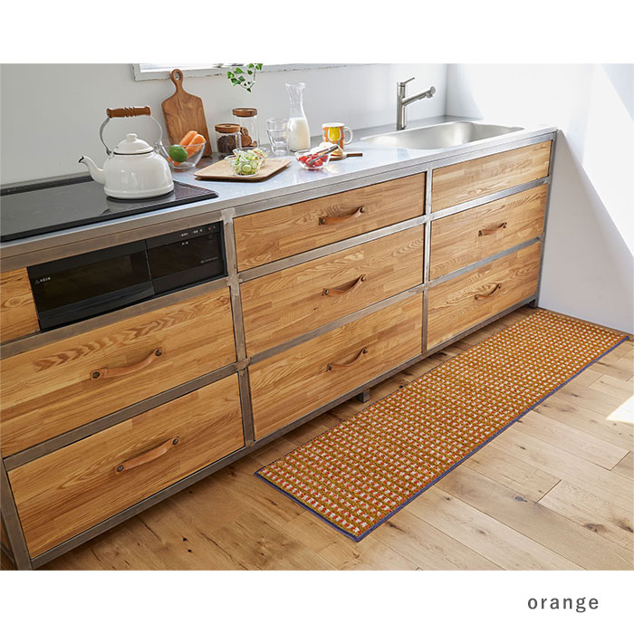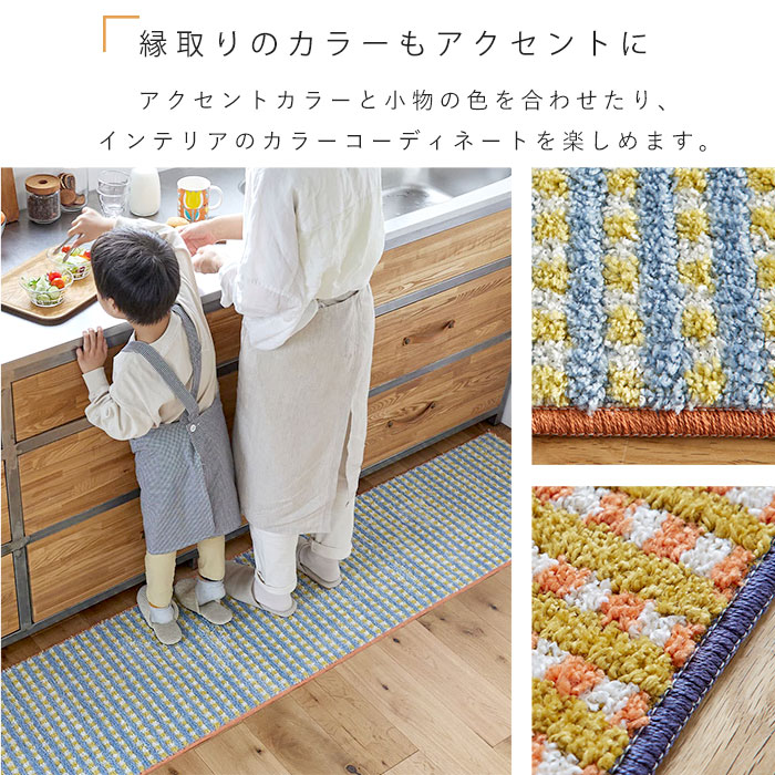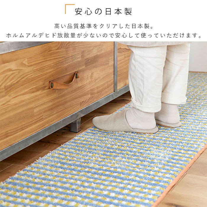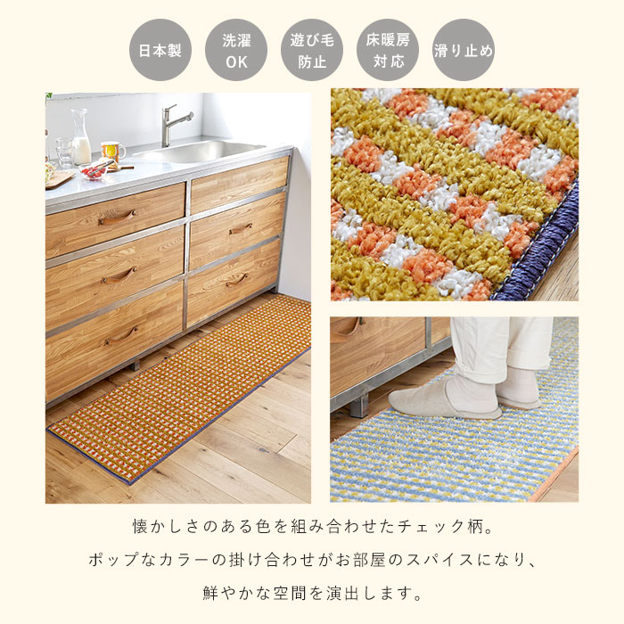 キッチンマット 日本製 マット 洗える おしゃれ かわいい 北欧 オールシーズン 45 180 滑り止め ウォッシャブル 床暖房対応 ホットカーペット対応 遊び毛防止 チェック レトロ オレンジ ブルー 長方形