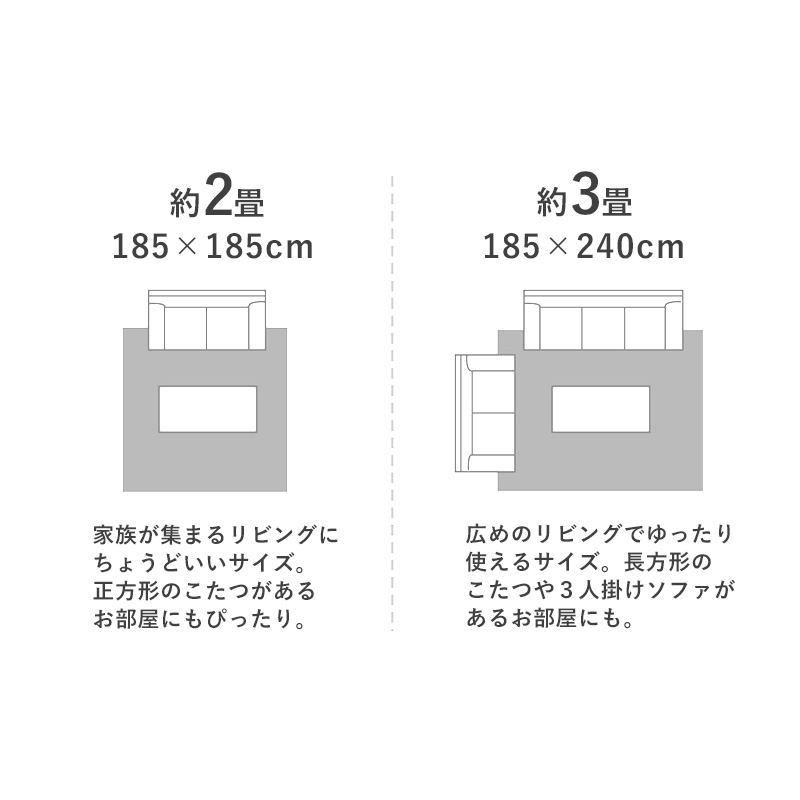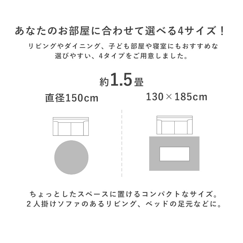 | 商品サイズ | (約)幅130cm×奥行き185cm (約)幅185cm×奥行き185cm (約)幅185cm×奥行き240cm (約)幅150cm×奥行き150cm(円形) |