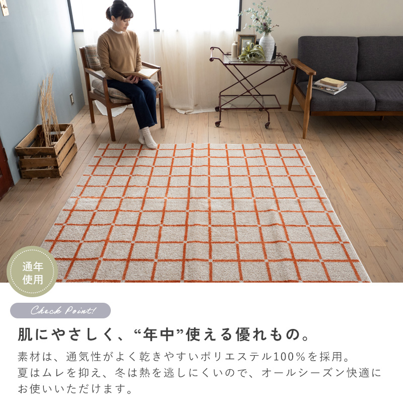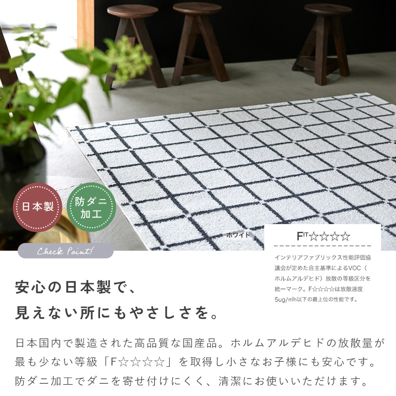 | エクリュは、日本製ならではの高品質と、暮らしを豊かにする機能性を兼ね備えたラグです。 清潔さと安心感を重視し、ホルムアルデヒドの放散量が最も少ない等級「F☆☆☆☆」を取得。 小さなお子様がいるご家庭でも安心してお使いいただけます。 さらに防ダニ加工に加え、アレルブロック機能を搭載。ダニのフンや死骸、スギ花粉などのアレルギー物質を吸着し、快適で清潔な空間を保ちます。 日々のお手入れも簡単。遊び毛がほとんど出ないため掃除がラクで、ご家庭の洗濯機で丸洗いも可能。裏面は滑り止め付きで、ずれにくく安全です。 素材は通気性がよく乾きやすいポリエステル100%。夏はムレにくく、冬は熱を逃がしにくいため、年中快適にご使用いただけます。さらに、ホットカーペットや床暖房にも対応する耐熱加工も施されています。 デザイン面では、「Othello(オセロ)」という名の通り、シンプルな格子柄のデザイン で、お部屋に洗練されたアクセントを加えてくれます。 カラーは、お部屋のイメージに合わせて選べるオレンジ、ブルー、ホワイトなどのベーシックカラーをご用意。 ふかふかの手触り と、飽きのこないシンプルな柄 で、毎日のくつろぎ時間をグレードアップしませんか? | |