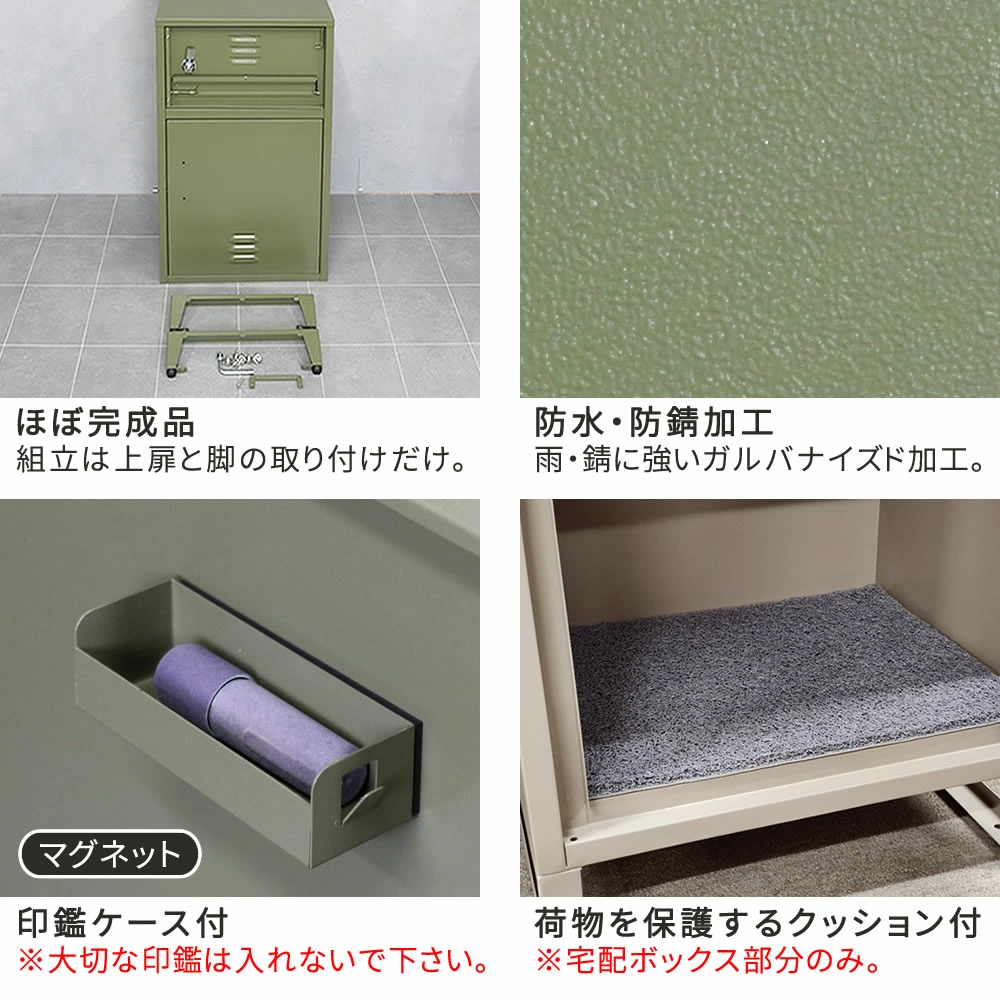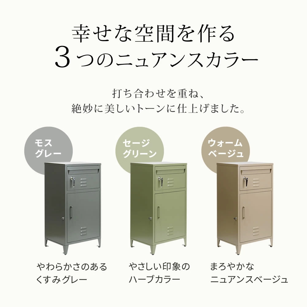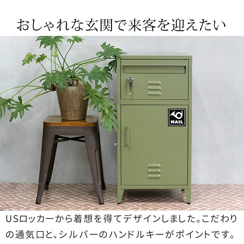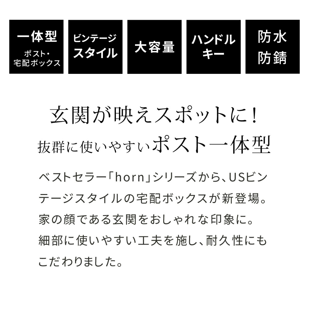 | 「玄関が映えスポットに!抜群に使いやすいポスト一体型」 ベストセラー「horn」シリーズから、USビンテージスタイルの宅配ボックスが新登場。家の顔である玄関をおしゃれな印象に。細部に使いやすい工夫を施し、耐久性にもこだわりました。 「幸せな空間を作る3つのニュアンスカラー」 打ち合わせを重ね、絶妙に美しいトーンに仕上げました。 「おしゃれな玄関で来客を迎えたい」 USロッカーから着想を得てデザインしました。都会のマンションにも、緑豊かな戸建てにも、木造の日本家屋にも馴染みます。 ・大容量宅配スペース(2Lペットボトル×9本箱が収納可) ・インダストリアル、西海岸、ブルックリン等、現代のテイストと好相性のデザイン。 ・メール便最大サイズOK ・押すだけ簡単プッシュキー ・特注の同色ハンドル ・説明用プレート/シグネチャープレート付 ・ほぼ完成品。組立は上扉と脚の取り付けだけ。 ・雨・錆に強いガルバナイズド加工。 ・印鑑ケース付 ・荷物を保護するクッション付 ・脚のガタつきを微調整できるアジャスター付 ・アンカーボルト4本付 ・アンカー用/ワイヤー用穴 | |