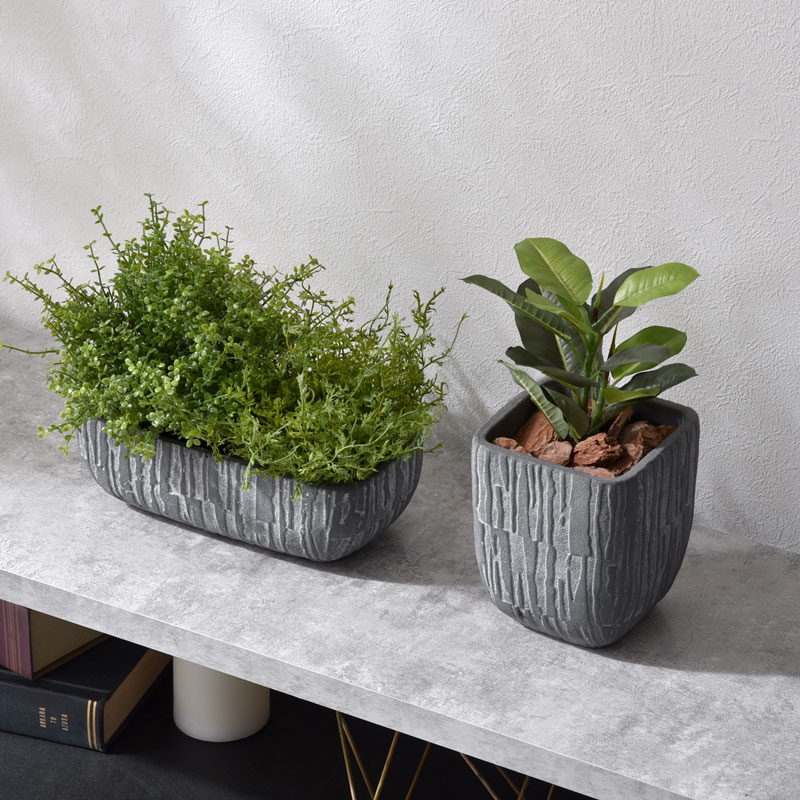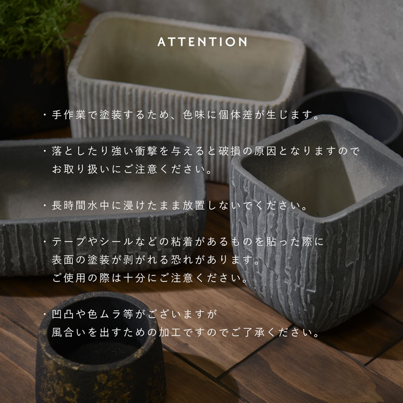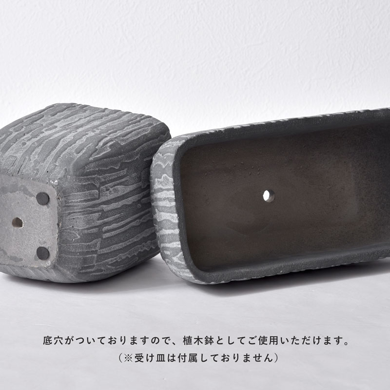 | 木の幹を縦に削ったような模様の陰影が 高級感を演出してくれるレクトポット シンプルながらもお部屋をかっこよく上品に演出してくれる アンティーク感のある植木鉢です。 サボテンや多肉植物、観葉植物、花の苗など どんな種類の植物にもぴったり合います。 もちろんドライフラワーなどもお手入れなしで気軽に使えます。 底穴がついておりますので、植木鉢としてご使用いただけます。 (※受け皿は付属しておりません) 滑り止めも付いておりますので安心です。 | |