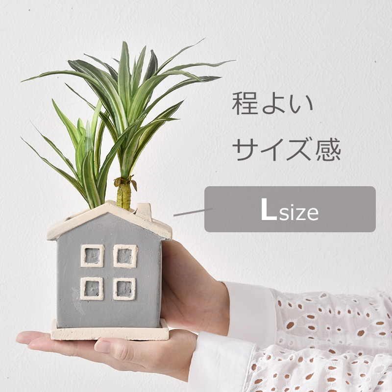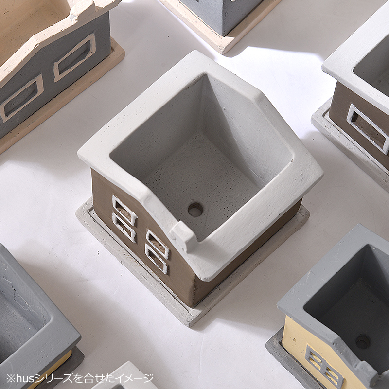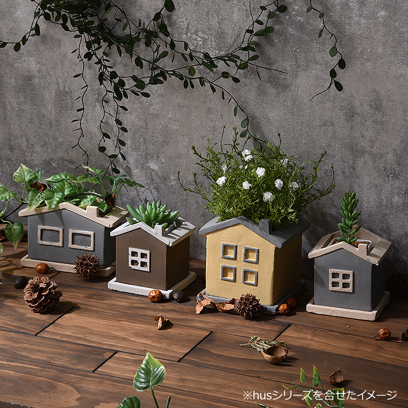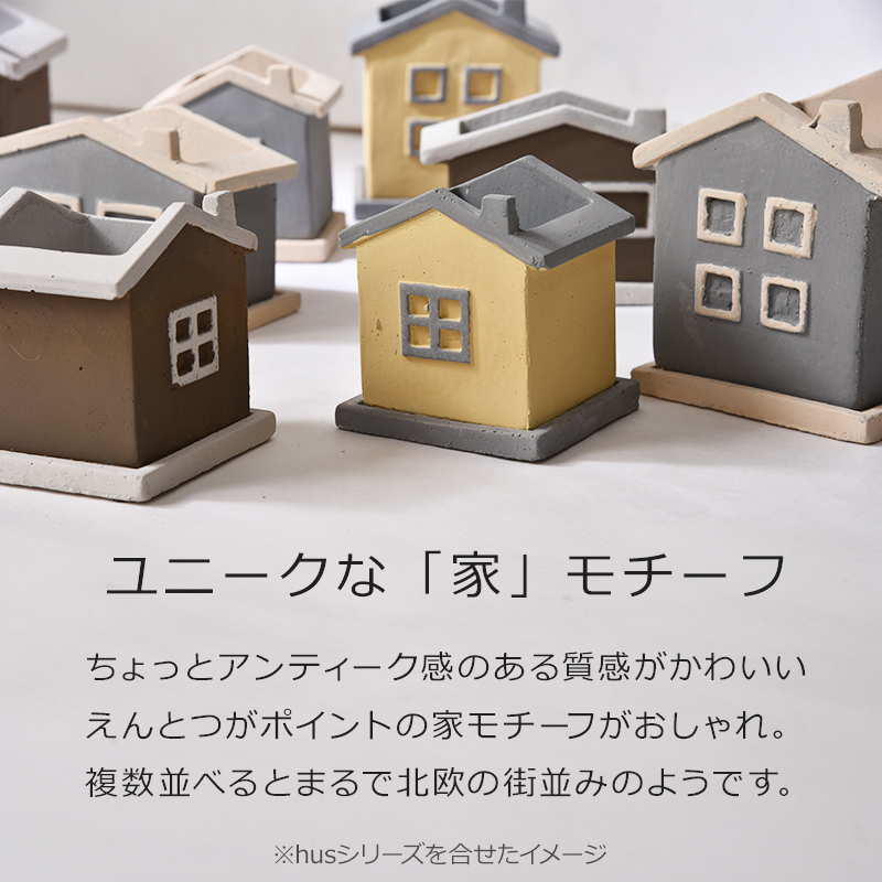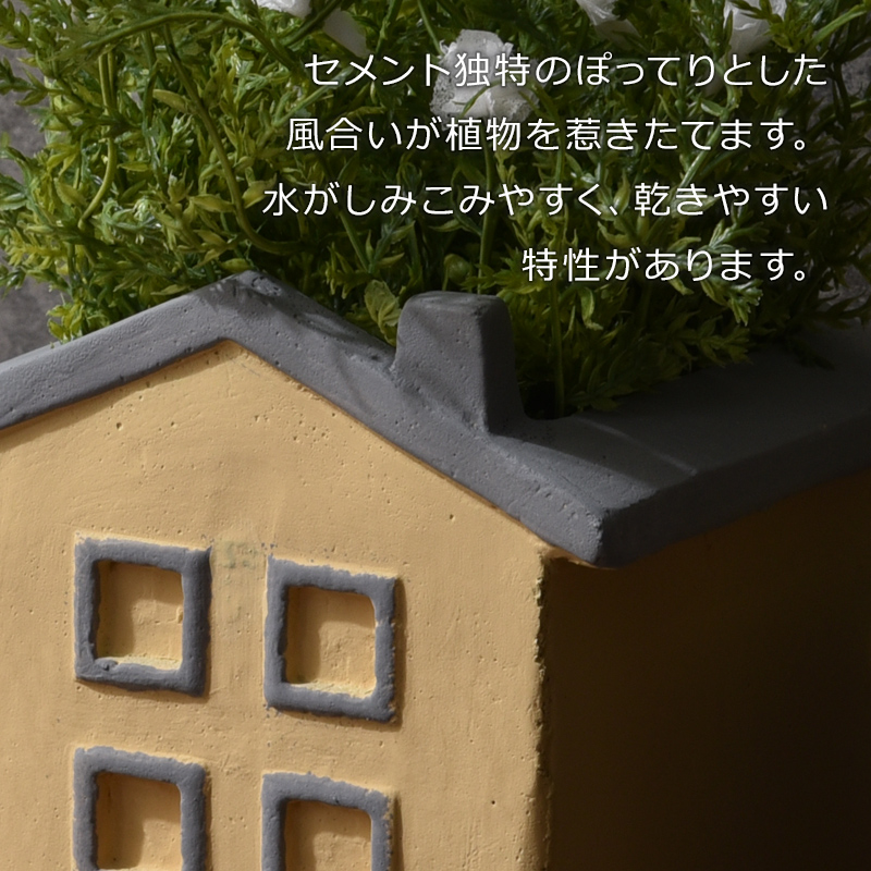 | お部屋に、緑とあたたかみを 北欧風の柔らかな色合いと、セメント独特のぽってりとした素朴な質感を活かした、あたたかみを感じさせる家の形のフラワーポットhusシリーズ。 ちょっとアンティーク感のある質感がかわいいえんとつがポイントの家モチーフがおしゃれ。 複数並べるとまるで北欧の街並みのようです。 セメント製で、室内でも、室外でも使えます。 水がしみこみやすく、乾きやすい特性があります。 防水性にすぐれ、紫外線や雨風にも強いので お庭など屋外でもお使いいただけます。 もちろん室内でもお使いいただけます。 底穴・受け皿付き 水はけがよくなり、直接植物を植えられる 底穴付き。また、屋内置きで便利な受け皿も付いています。 かわいいデザインは、お部屋のワンポイントとしても。フェイクグリーンとも相性がよくちょっとした小物入れにも活用できます。 | |