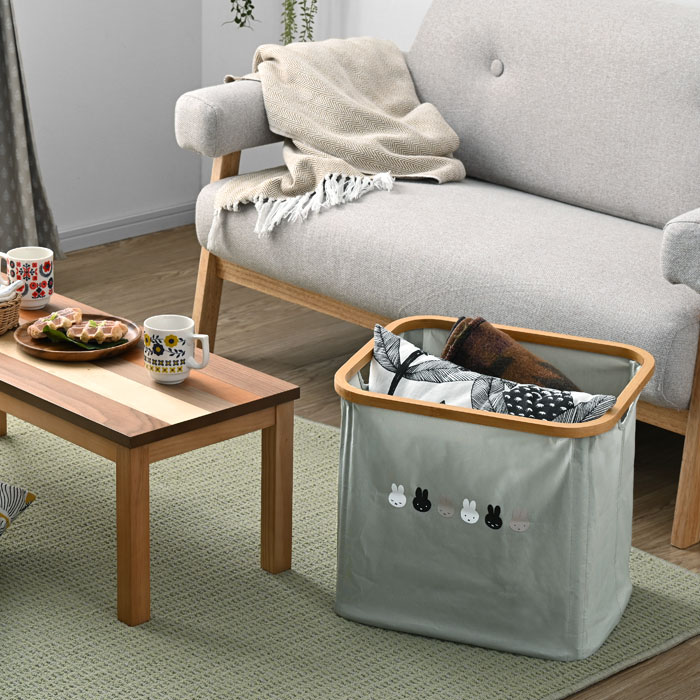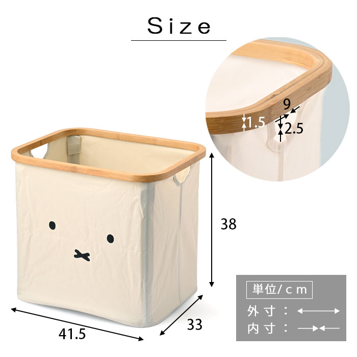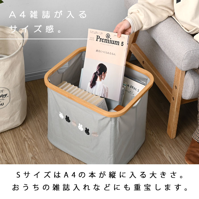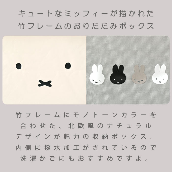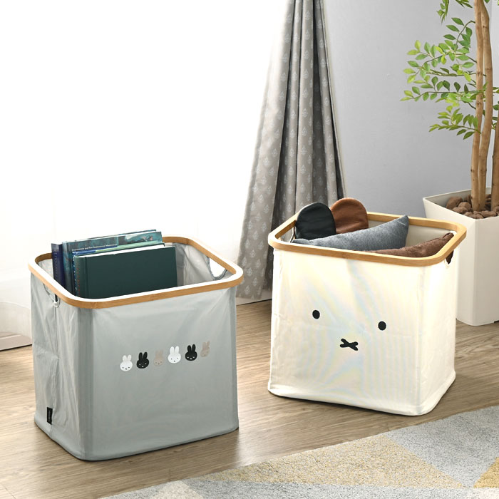 | 竹フレームにモノトーンのカラーを合わせた、北欧風のナチュラルデザインが魅力の収納ボックス。 内側に撥水加工が施されているので、洗濯かごにもおすすめの折りたたみ可能なバスケットです。 お部屋での使い方に合わせた2サイズをご用意しており、お好きなサイズをご選択いただけます。 MサイズはA4サイズの本などが縦向きに入る大きさで、リビングでの雑誌入れなどにも重宝します。 折り畳み可能なので、使わない時はコンパクトに収納でき、簡単に組み立てができるので使うときはサッと使用できるのが嬉しいポイント! 雑貨や食品を入れたり、洗濯かごとして使ったり。 可愛いミッフィーの絵柄は、お部屋に置くだけでおしゃれです。 | |
