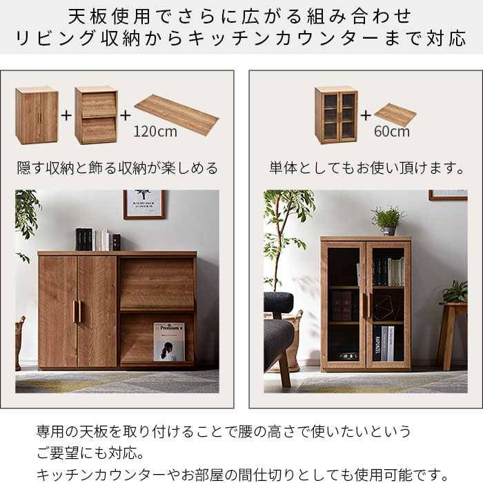 | 国産ユニット食器棚シリーズには別売りの専用天板をご用意しております。 単体でのご使用時に必要な60cmタイプ、2台の収納を横に連結できる120cmタイプをご用意。 こちらの天板を使用して頂くことで組み合わせ方はさらに広がり、お好みの形にしてお楽しみ頂けます。 単体でオシャレに縦横自在に組み合わせてあなたの理想の空間を演出。 | |