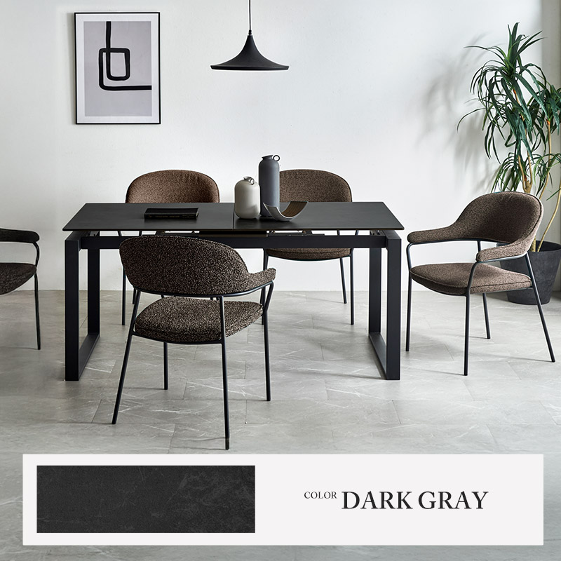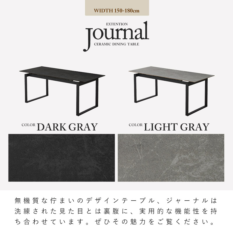 | 無機質な佇まいのデザインテーブル、ジャーナルは洗練された見た目とは裏腹に、実用的な機能性を持ち合わせています。 【スライド式の天板伸長デザイン】 天板を横にスライドさせて戻すだけの簡単ステップで伸長が可能です。戻すときも同じ動作で元通りに。 天板の最小幅は約150cm。この状態でも4人で余裕をもってお使いいただけるサイズ感です。 来客時や沢山の料理をふるまうホームパーティーの際には、幅約180cmの広々天板が役立ちます。 【機能性に優れたセラミック天板】 天板には厚み約1cmのセラミック製天板を採用。 ストーン調のまだら模様が魅力的。 ライトグレーとダークグレーの2色からお選びいただけます。 セラミックの特量について ●耐久性 キズや汚れに強く、品質長持ち。 汚れにも強くお手入れも簡単です。 ●耐水性 水気にも強いので、飲み物をこぼしてしまっても サッと拭き取れます。 ●耐熱性 例えば、できたての料理など、 熱いものをそのまま置いても大丈夫。 【しっかり丈夫なロの字型脚】 脚部にはロの字型のアイアン脚を採用。ロの字型はスタイリッシュな見た目だけでなく、安定感に優れ、 脚の位置が端に寄るので椅子の出し入れや人の出入りがしやすいメリットもあります。 | |