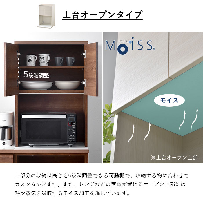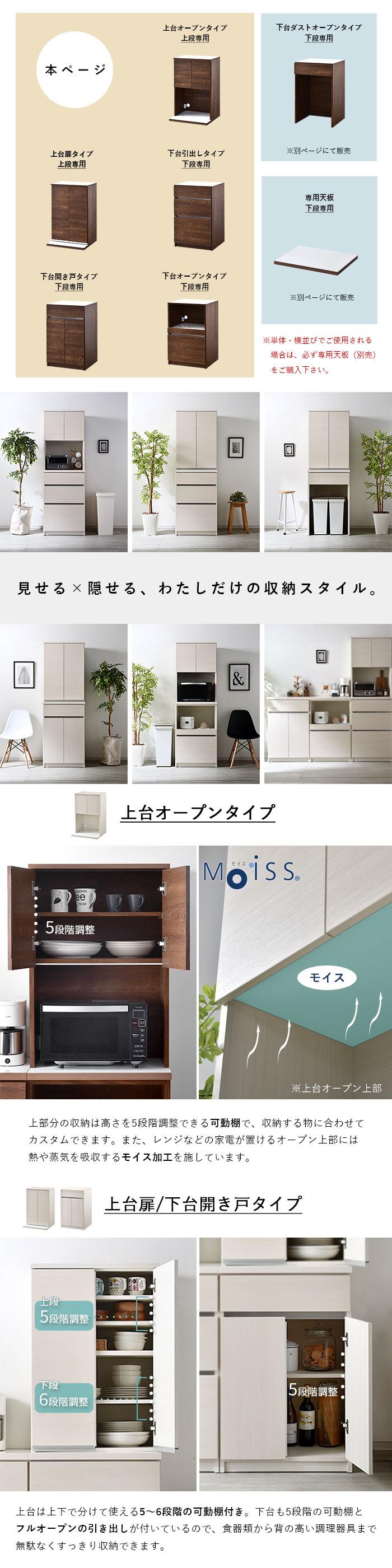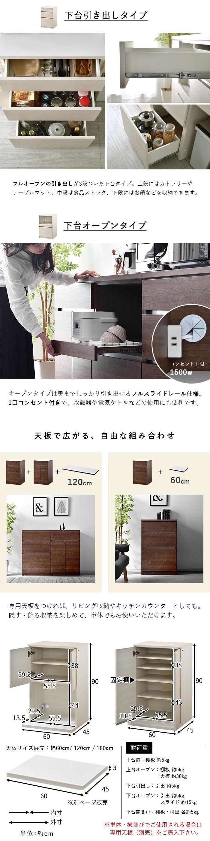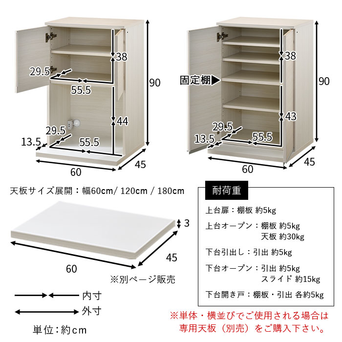 | 耐荷重 | 上台扉タイプ/棚板:(約)5kg 上台オープンタイプ/棚板:(約)5kg、天板:(約)30kg 下台引出しタイプ/引出:(約)5kg 下台オープンタイプ/引出:(約)5kg、スライドカウンター:(約)15kg 下台開き戸タイプ/棚板:(約)5kg、引出:(約)5kg |