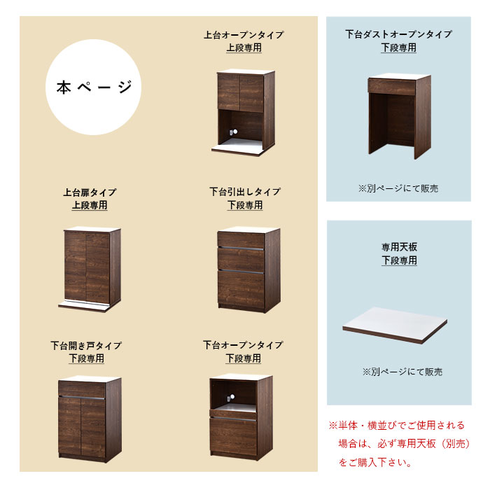 | 取扱タイプ | 上台扉タイプ/ホワイト(白)、上台扉タイプ/ブラウン、上台オープンタイプ/ホワイト(白)、上台オープンタイプ/ブラウン、下台引出しタイプ/ホワイト(白)、下台引出しタイプ/ブラウン、下台オープンタイプ/ホワイト(白)、下台オープンタイプ/ブラウン、下台開き戸タイプ/ホワイト(白)、下台開き戸タイプ/ブラウン |