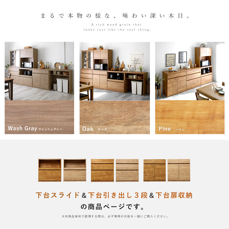 | 取扱タイプ | 扉/オーク、扉/パイン、引出/オーク、引出/パイン、スライド/オーク、スライド/パイン、扉/ウォッシュグレー、引出/ウォッシュグレー、スライド/ウォッシュグレー |