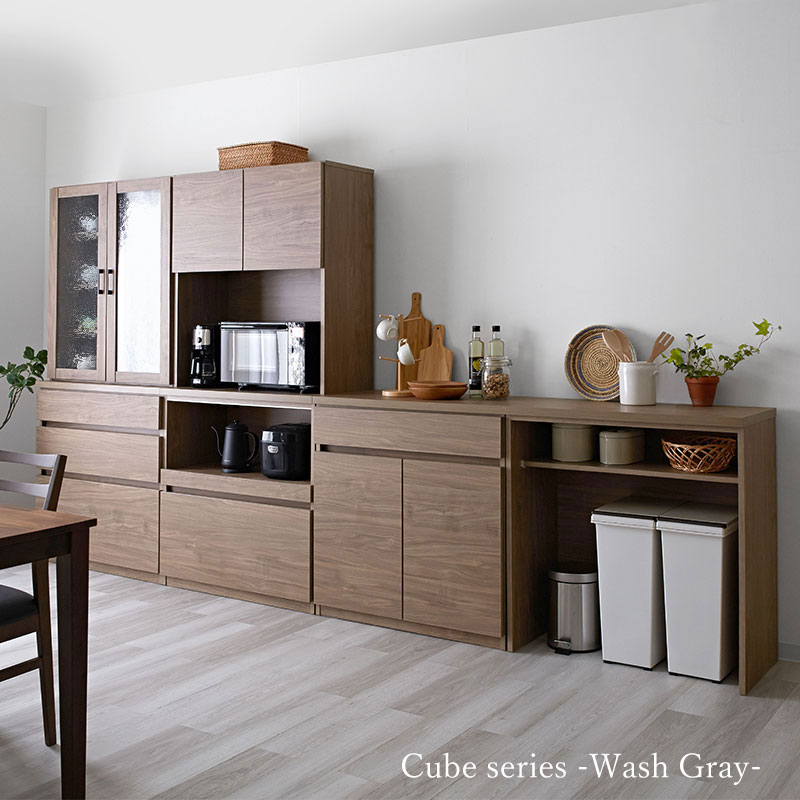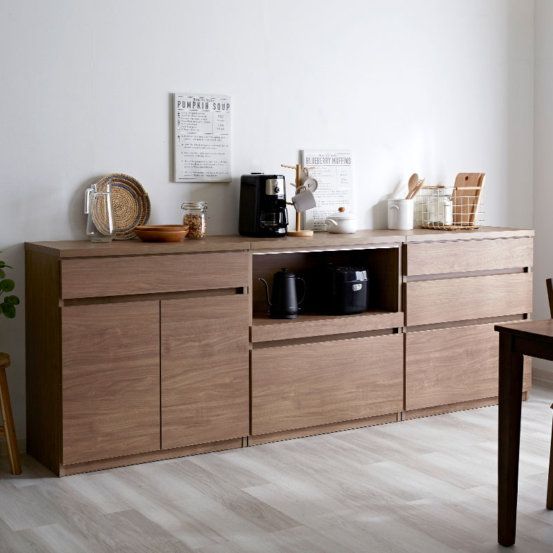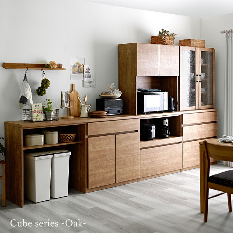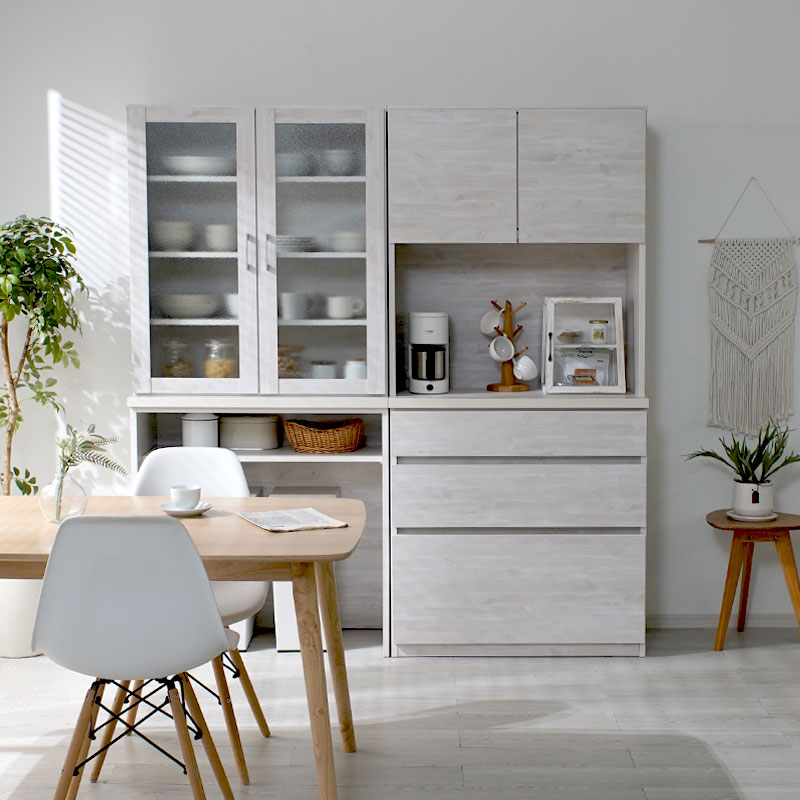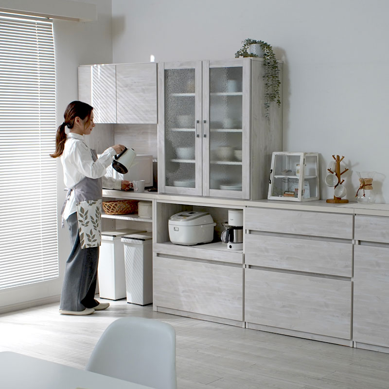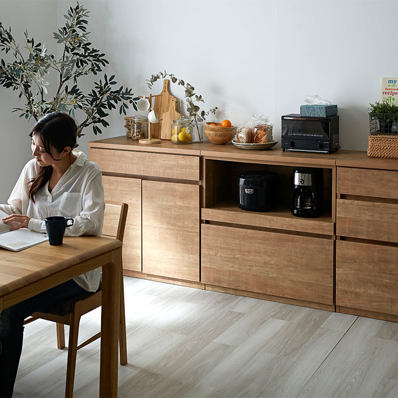 組み合わせによって見た目の印象も変わり、お部屋のコーディネートも自由自在に。見せる収納と隠す収納の豊富なバリエーションで自分好みで暮らしにあったキッチンスペースを。