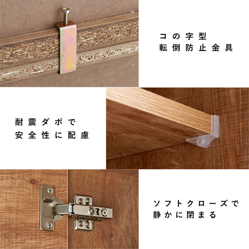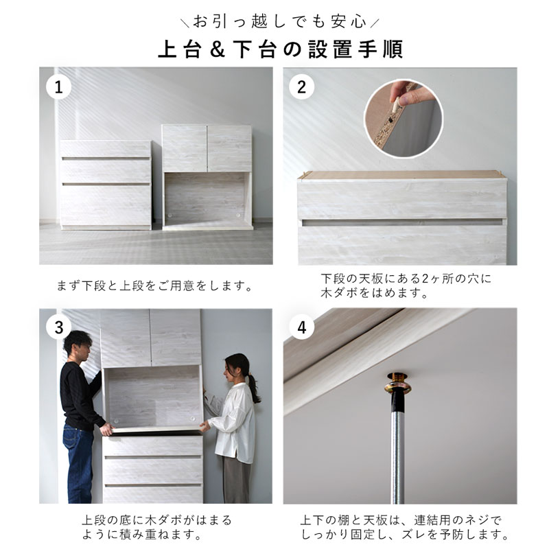 ガラスの加工がオシャレで、かつ収納力も抜群で購入して良かったと思います。1人では下段との組み立てが難しそうなので、組み立て・設置サービスがあり助かりました。耐震に少し不安があるので、突っ張り棒のような物を買って取り付けようと思います。