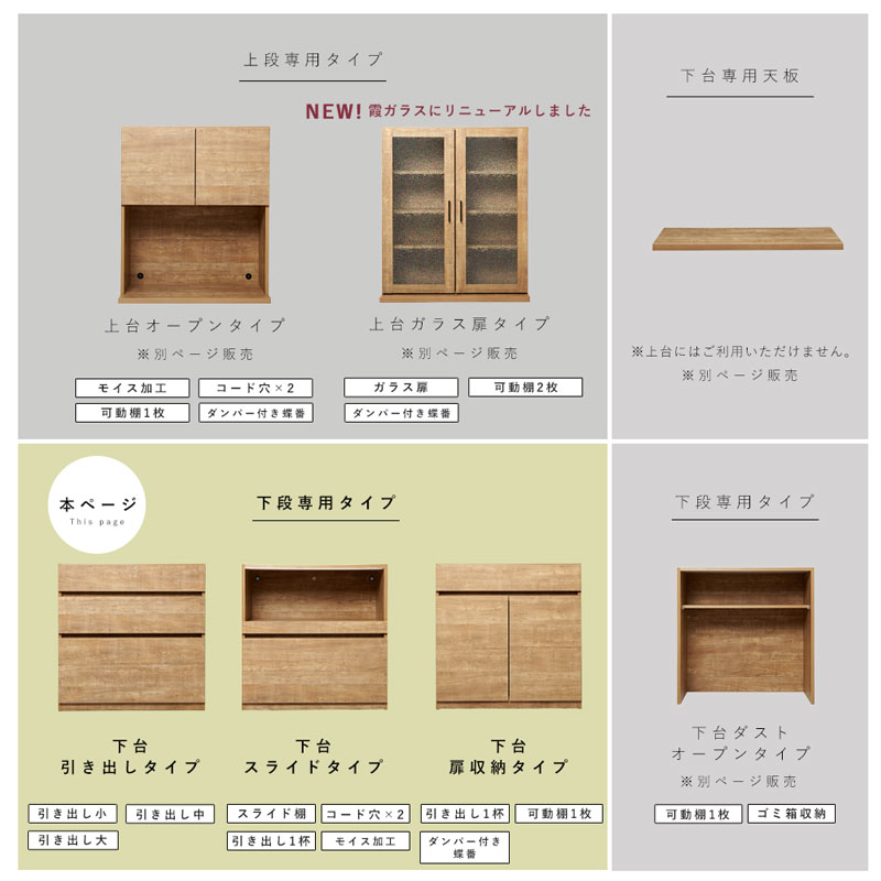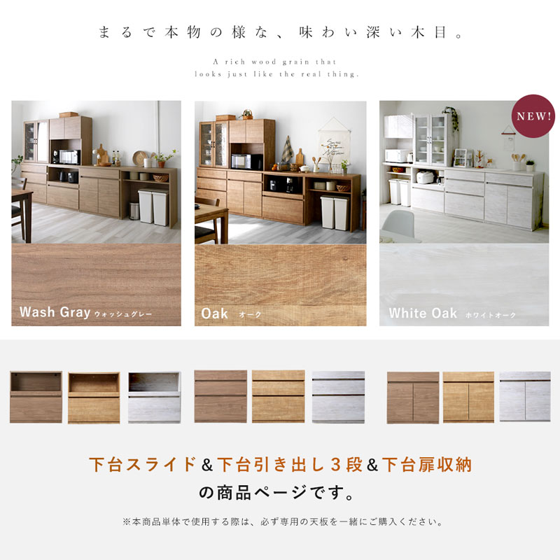 取扱タイプ扉/オーク、扉/パイン、引出/オーク、引出/パイン、スライド/オーク、スライド/パイン、扉/ウォッシュグレー、引出/ウォッシュグレー、スライド/ウォッシュグレー、扉/ホワイトオーク、引出/ホワイトオーク、スライド/ホワイトオーク