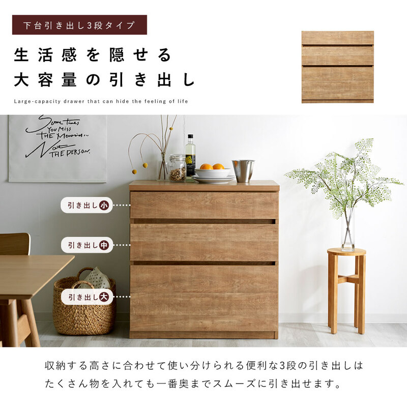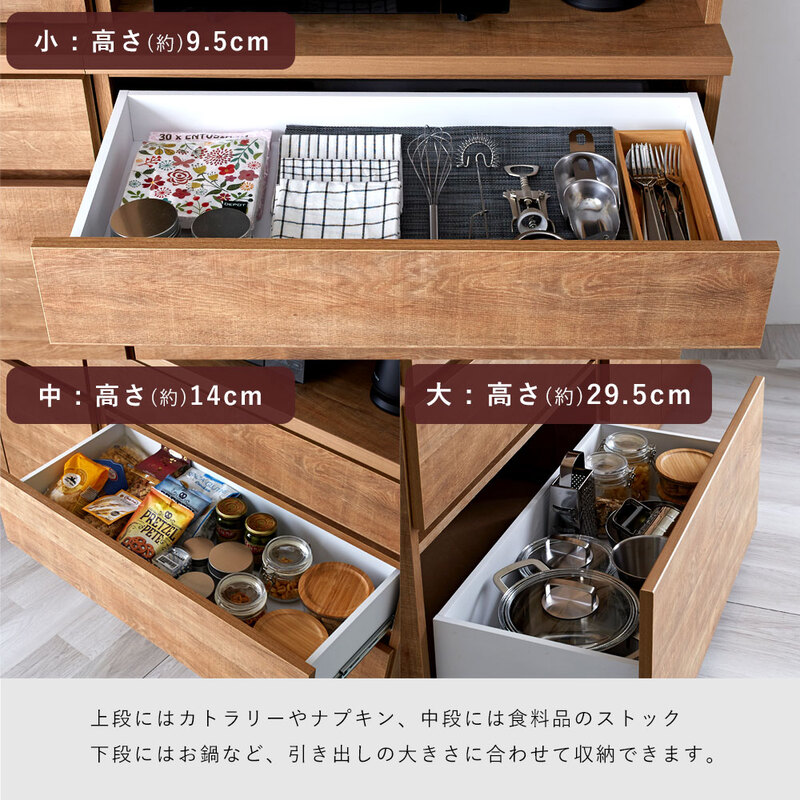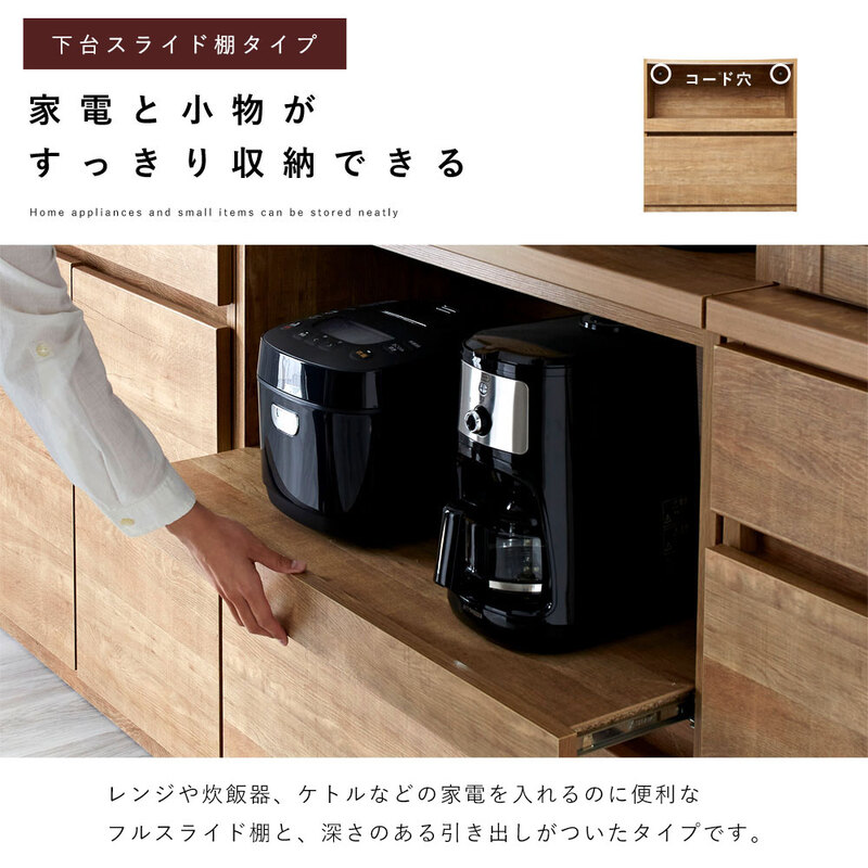 幅が広いため、炊飯器、ケトル、+α設置ができそうです。奥行きの深さがちょうどよく、炊飯器(5.5号炊き)がピッタリ収まりました。引き出しも深いのでかなり収納できでありがたいです。